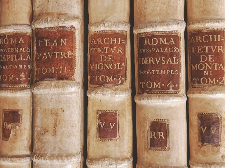 Bajo las letras R y V duplicadas se agrupan los tomos dedicados a la Arquitectura, cuatro por cada una de ellas, tres de ellos perdidos. De la primera, de los que solo se conservan dos tomos (RR2 y RR4) contienen las obras Insignium Romae templorum, Disegni di vari altari e Capelle, Palazzi de Romade piv celebri architetti, todas ellas promovidas por Giovanni Giacomo De Rossi, y In Ezechielem explanationes et apparatus urbis ac templi hierosolymitani de Jerónimo de Prado y Juan BautistaVillalpando. A este conjunto se podría quizá asociar el único tomo de dos que se ha conservado de estampas de ornamentación y decoración de interiores de Jean Lapautre y seguramente también el tomo que contiene las estampas el primer volumen del Studio darchitettura Civile, editado por Domenico de Rossi.