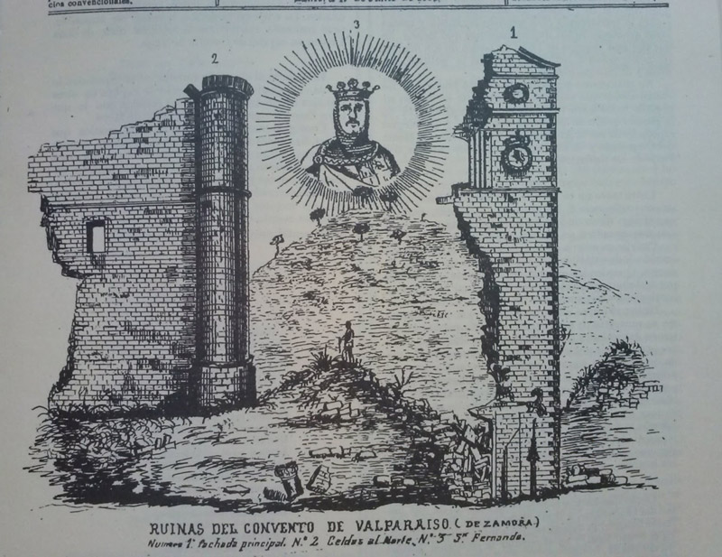 Ruinas del monasterio de Nuestra Señora del Paraíso según la litografía publicada en la revista Zamora Ilustrada, tomo I, año 1º, nº 13, 1 de junio de 1881.