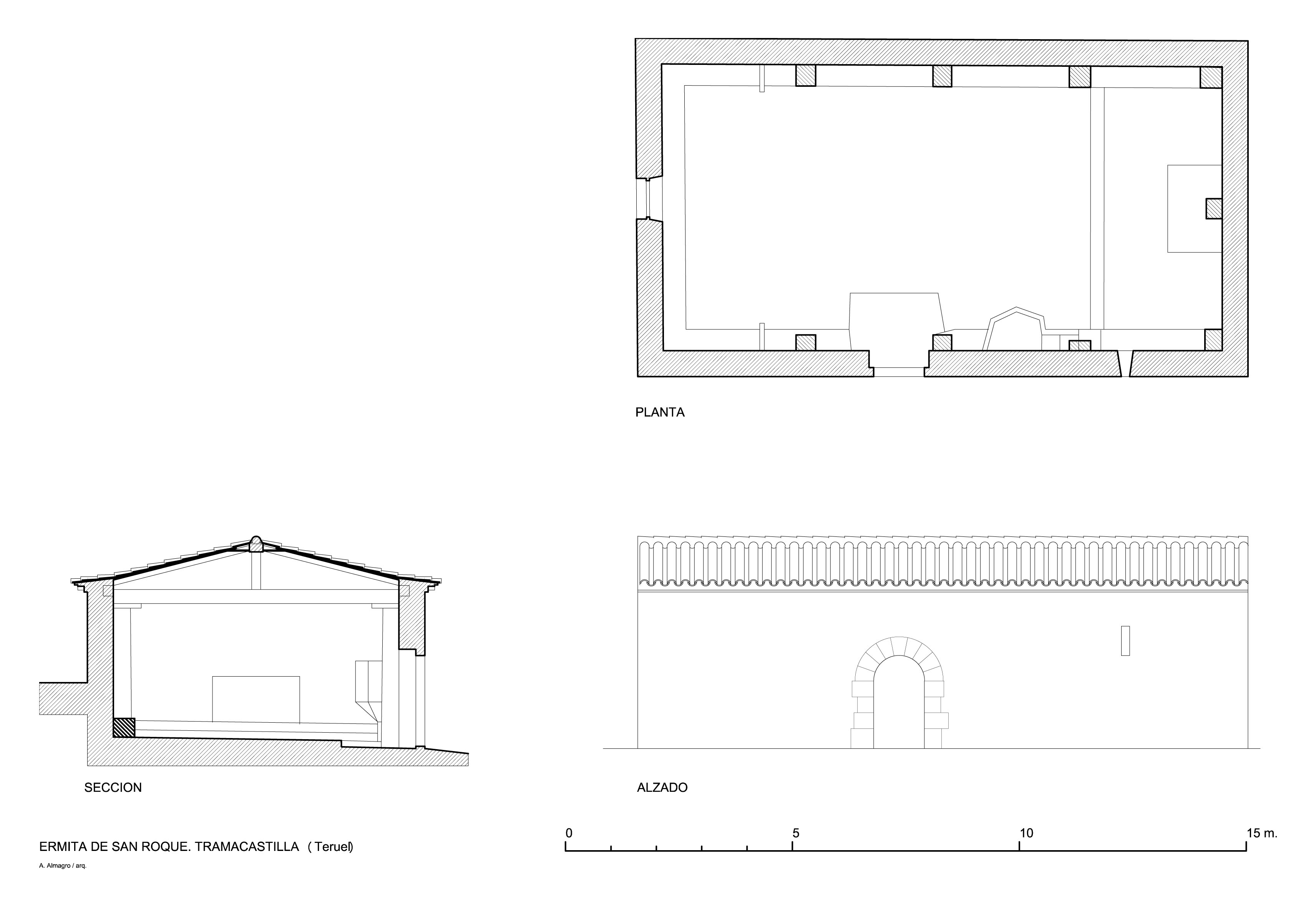 Planta, alzado y sección de la ermita de San Roque de Tramacastilla