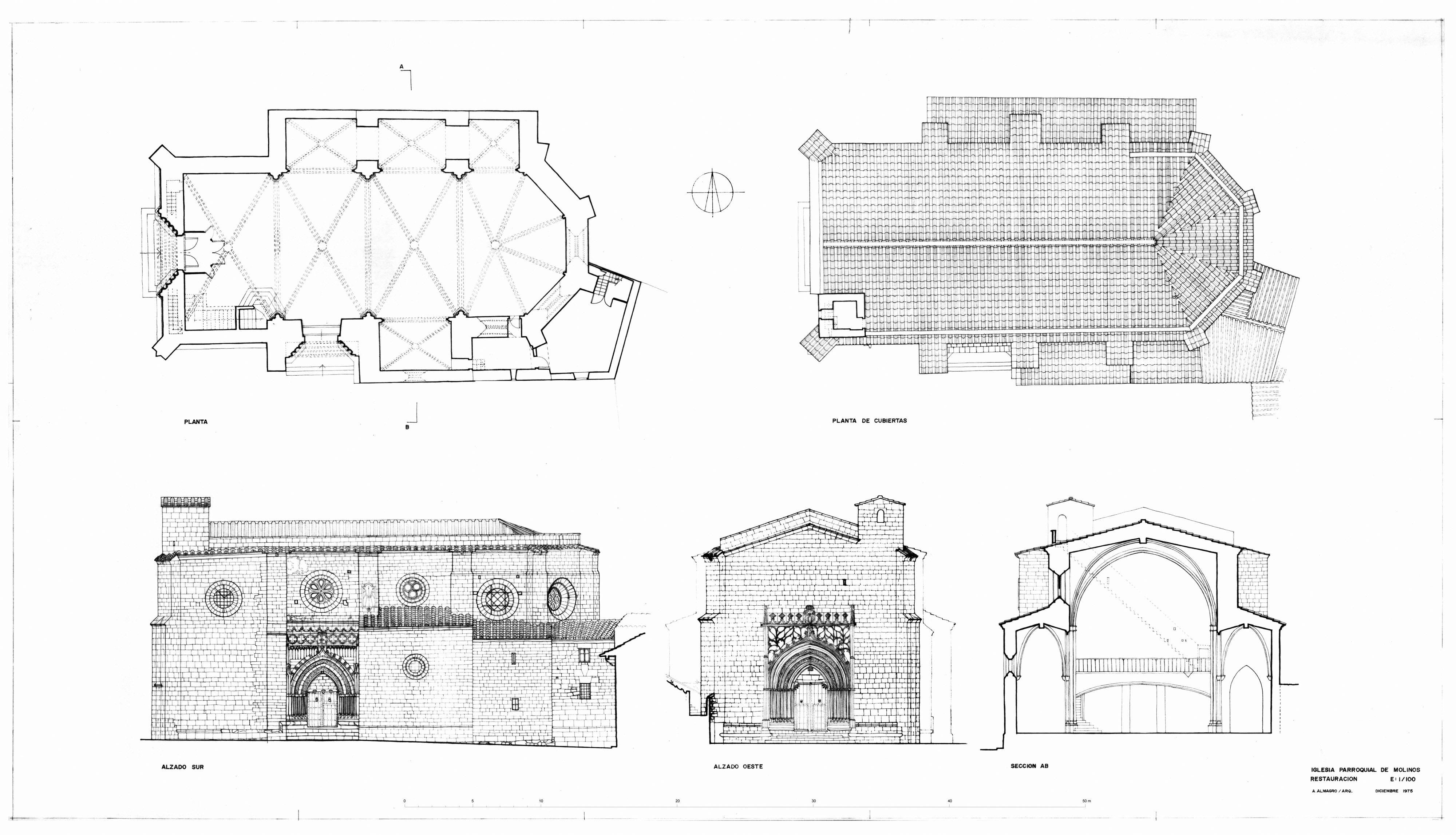 Plantas, alzados y sección de la iglesia parroquial de Molinos (Teruel) - Restauración