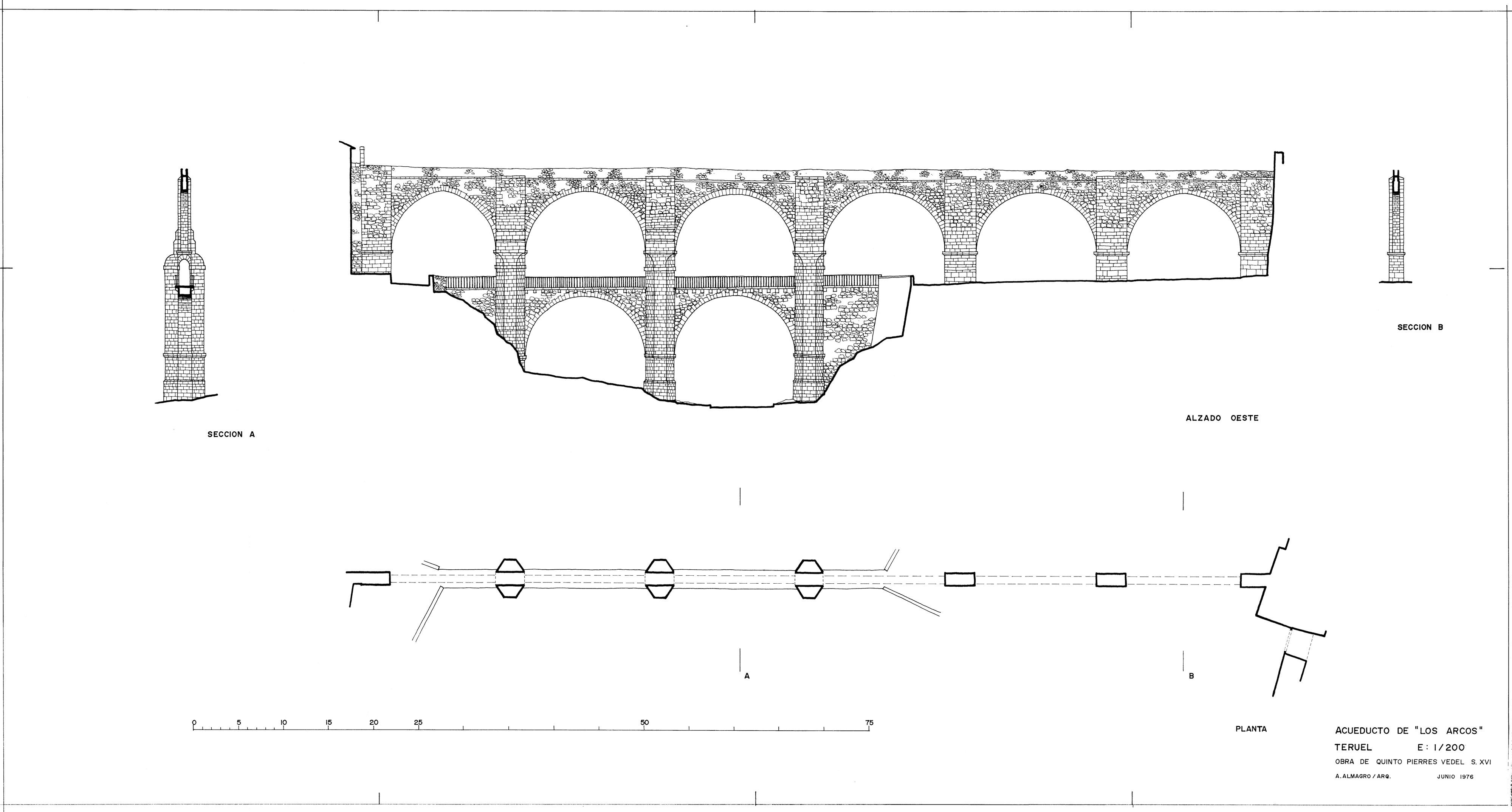 Planta, secciones y alzado del tramo final del acueducto de los Arcos de Teruel