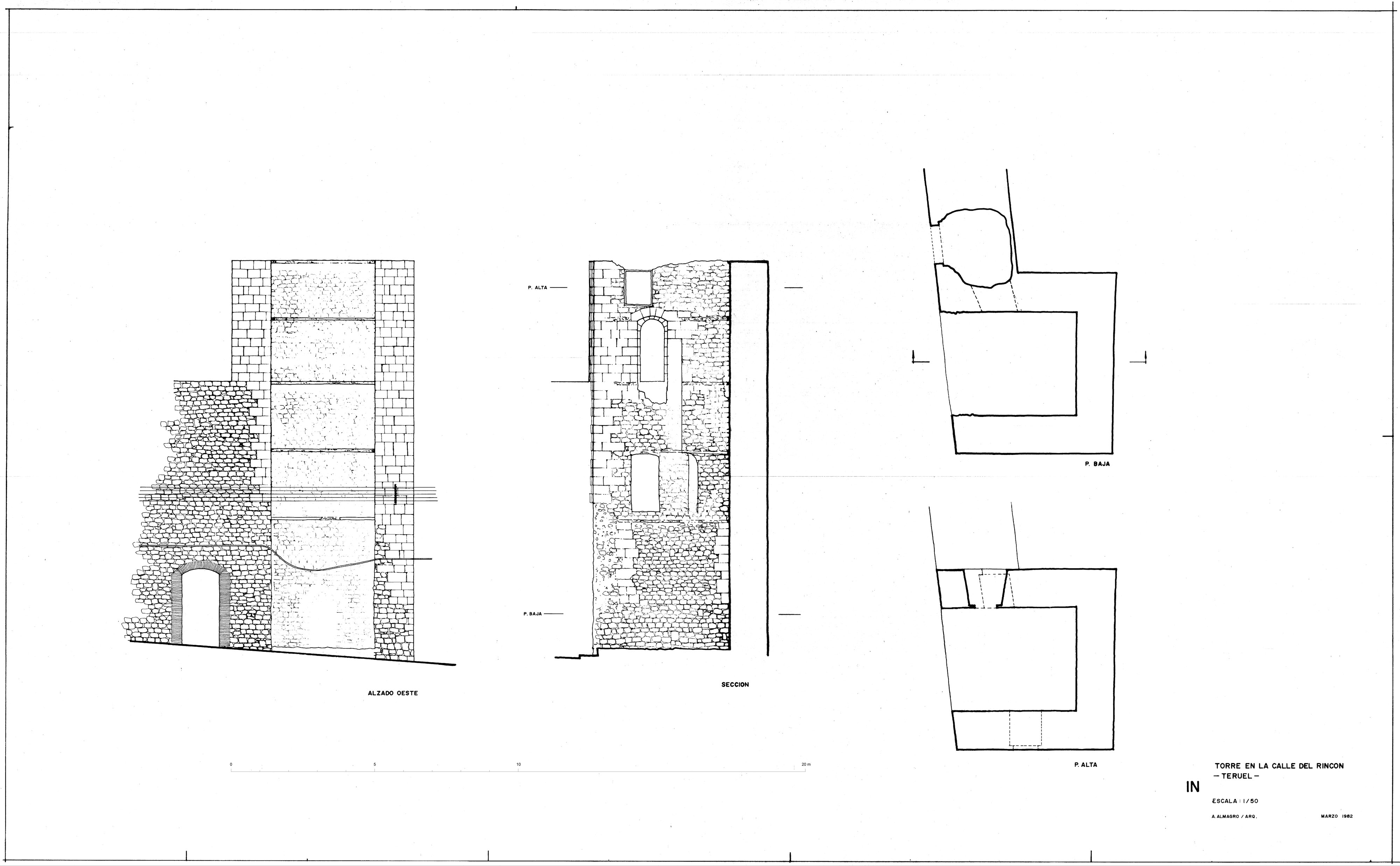 Plantas, alzado y sección de la torre de la calle del Rincón de Teruel. Estado inicial