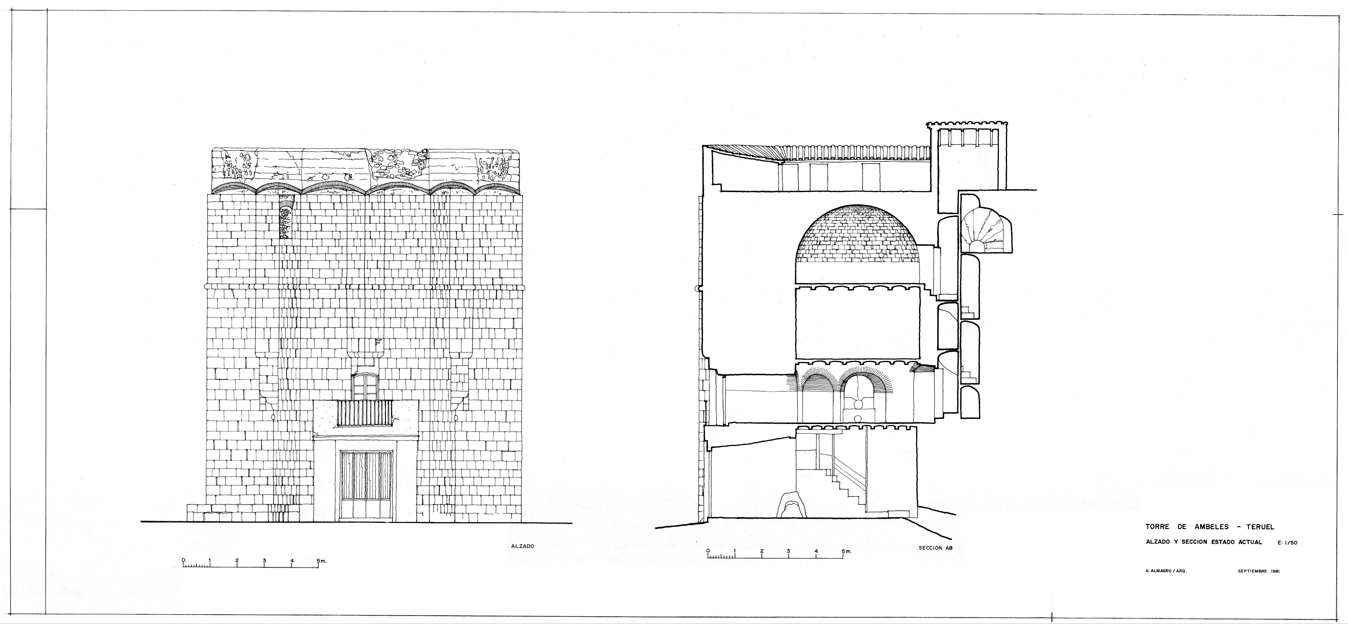 Alzado y sección de la torre de Ambeles de Teruel. Estado inicial