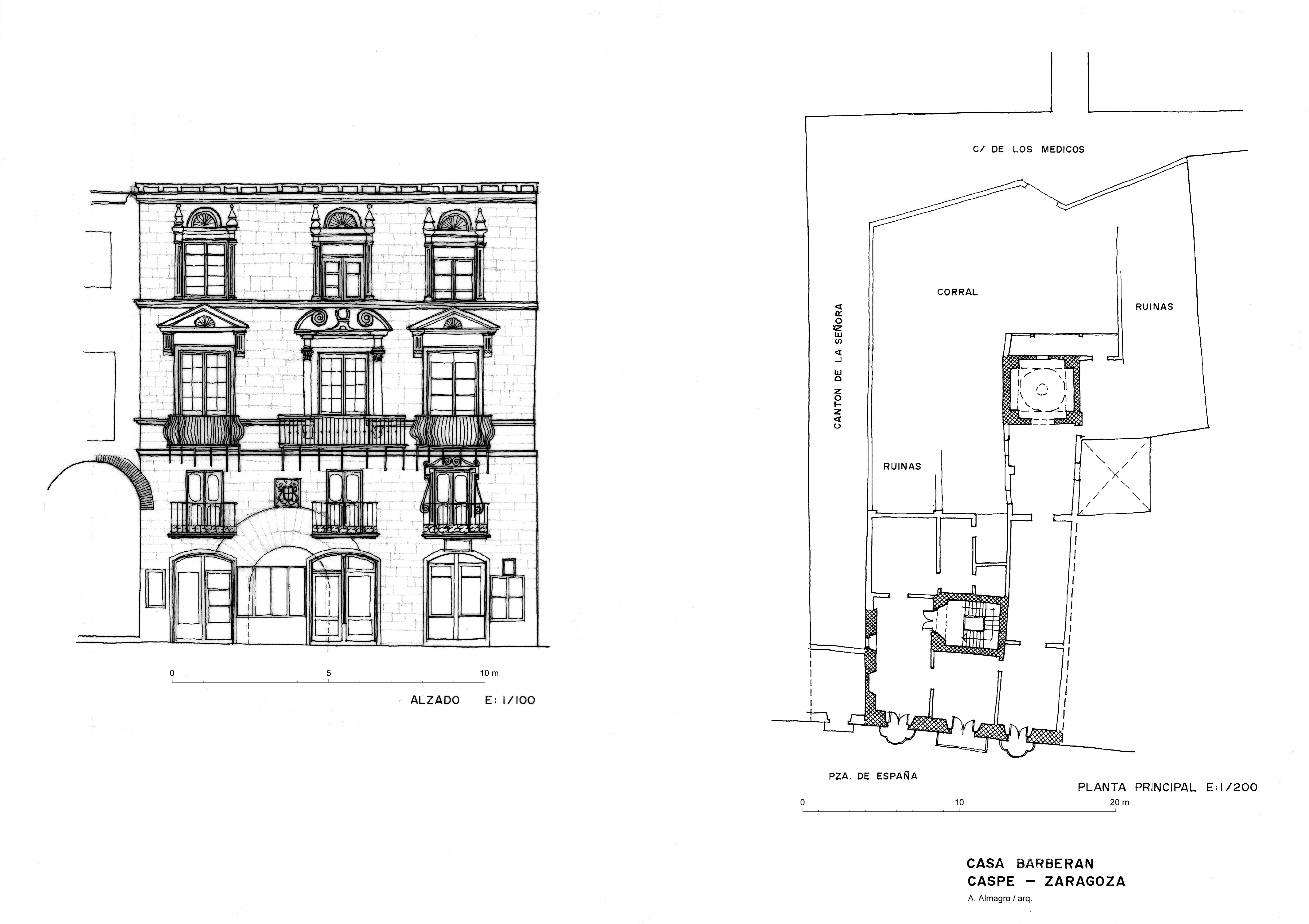 Planta y alzado de la casa Barberán en Caspe (Zaragoza)