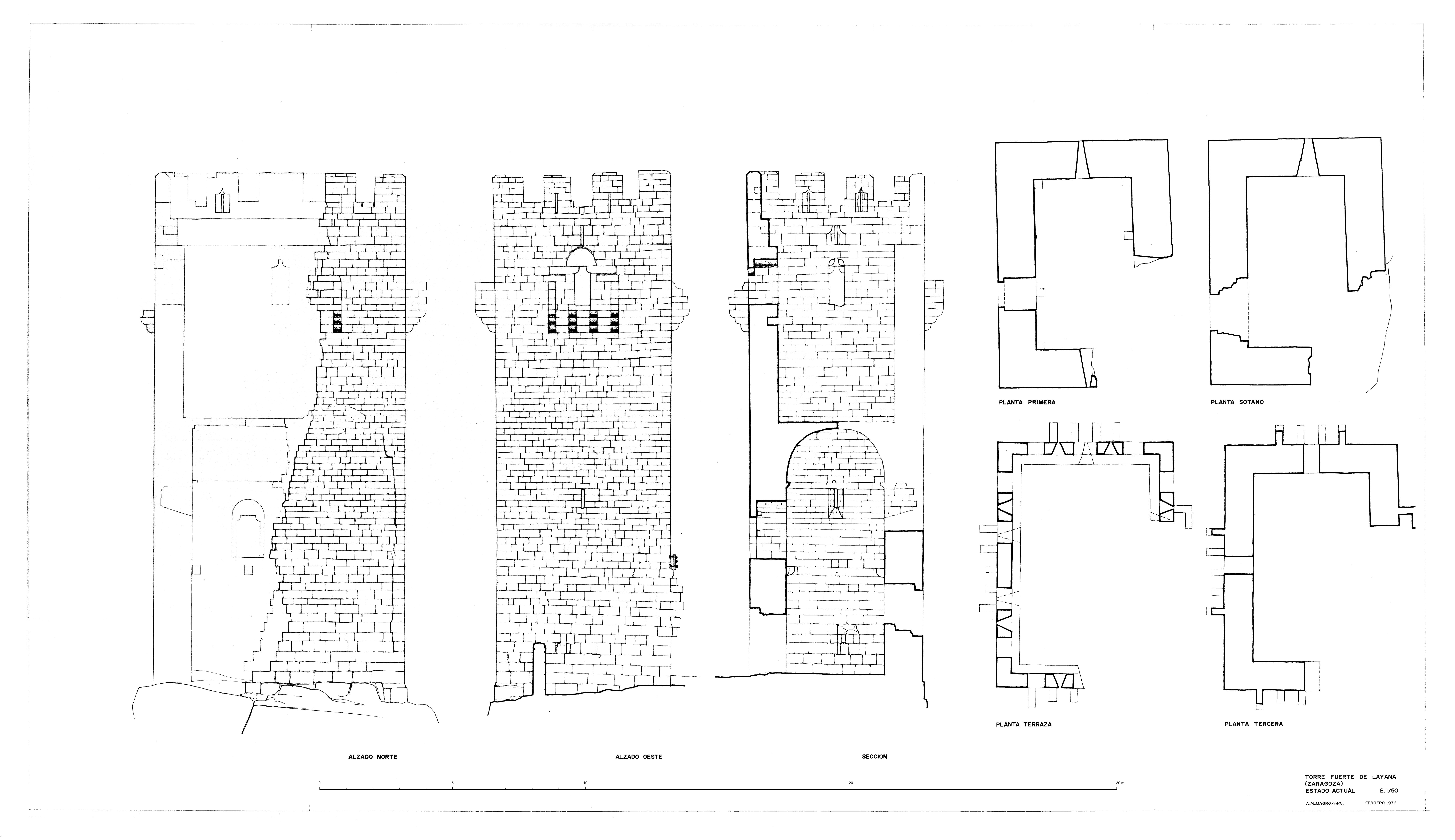 Plantas, secciones y alzados de la torre fuerte de Layana (Zaragoza), estado inicial
