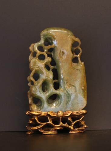 Observaciones: Muy característico dentro de las representaciones en jade son las llamadas "Montañas de longevidad" que empezaron a realizarse en la época Ming, continuando hasta nuestros días. Son bloques irregulares trabajados como una montaña sobre la que se esculpen detalles como pinos, pabellones, animales, personajes, así como el hongo sagrado de la longevidad, implicando un deseo de larga vida. Ejecutados con gran naturalismo expresivo, muestran una destacada armonía entre el hombre y la naturaleza. No son bloques compactos ya que las figuras aparecen casi de bulto redondo, horadando incluso la materia en algunos puntos.