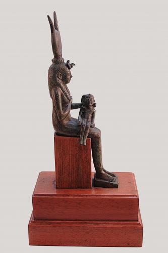 Observaciones: De bronce macizo. El niño es figura aparte pegada al cuerpo de la diosa. Isis viste un traje largo y ajustado sobre el que lleva un ancho collar. Cubre su cabeza con una bella peluca sobre la que se sitúa la Corona del Buitre, símbolo de la realeza femenina atestiguada desde la V Dinastía y que se relaciona con la diosa Nejbet del Alto Egipto así como con la maternidad. En la frente ostenta doble