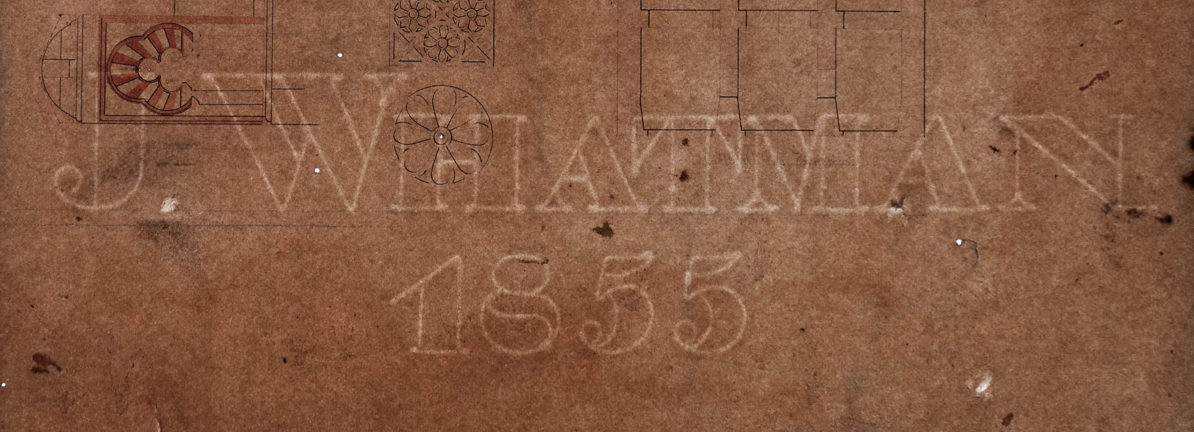 Fecha: 1839 • Nº Inventario: A-3171 • Medidas: 562 x 828 mm; escale gráfica en pies castellanos. • Técnica: Papel avitelado ahuesado. Tinta negra y roja y aguada rosa y beige.