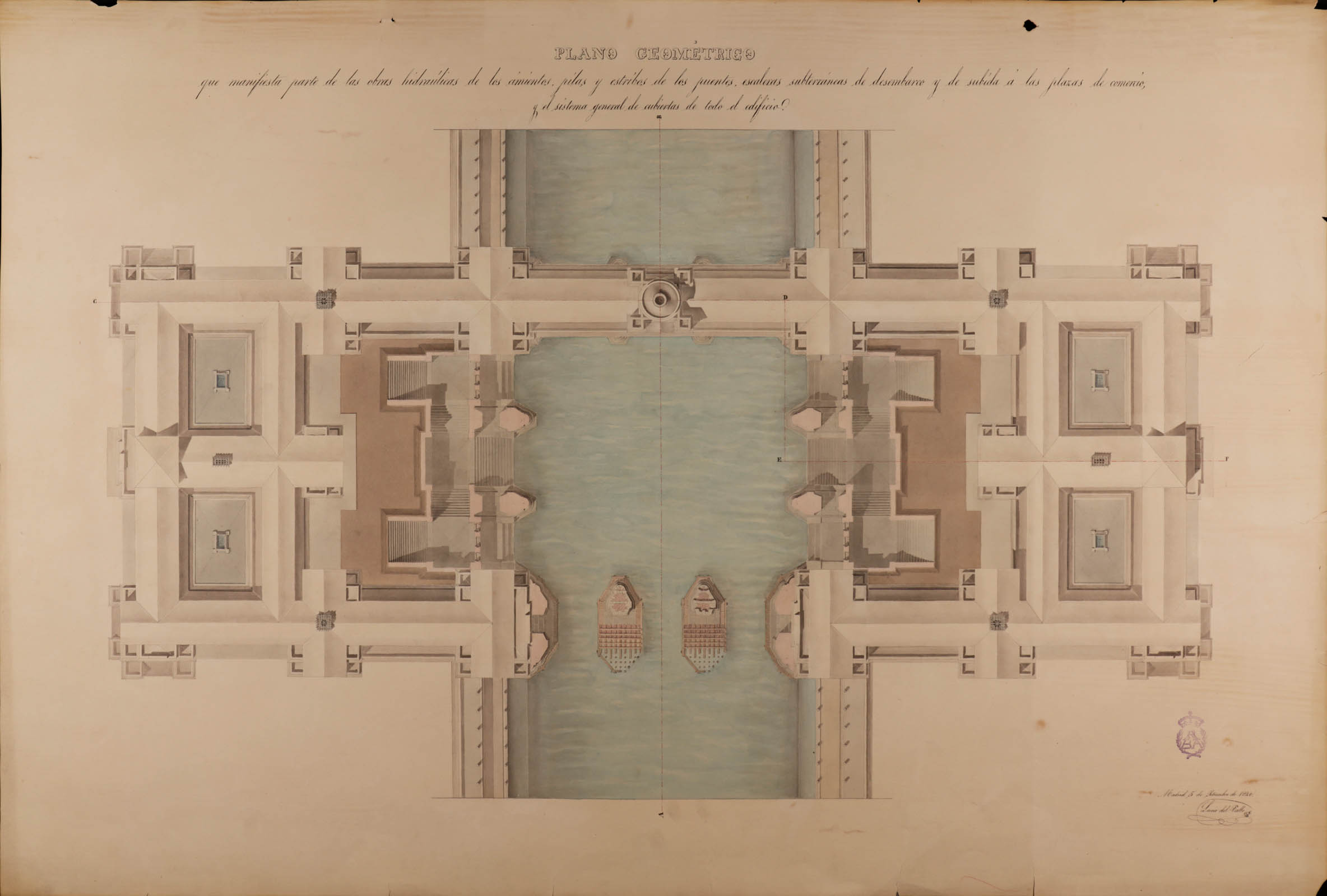 Plano geométrico de las obras hidráulicas de los cimientos, pilas y estribos de los puentes y el sistema de cubierta de una aduana en una ría navegable