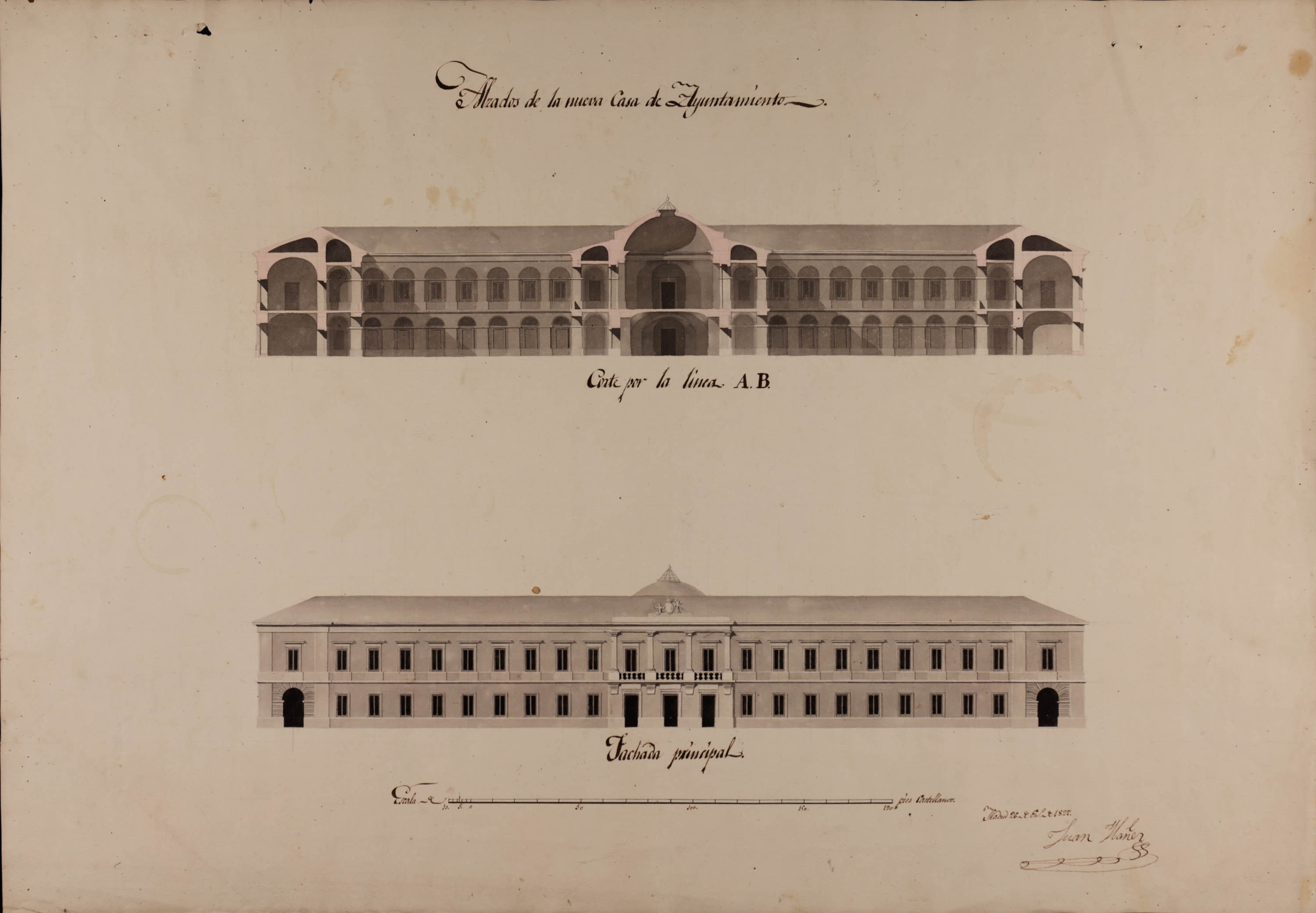 Alzado de la fachada principal y sección AB de un casa de ayuntamiento para una de las ciudades subalternas del reino