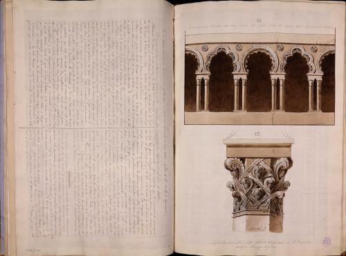 Leyenda a tinta sobre el primer dibujo: "Trozo de una galeria que hay sobre los arcos a los dos lados de la Iglesia del Corpus", y, la pie del segundo dibujo: "Capiteles que están sobre pilares ortogonales en el Corpus / antigua sinagoga de judios".