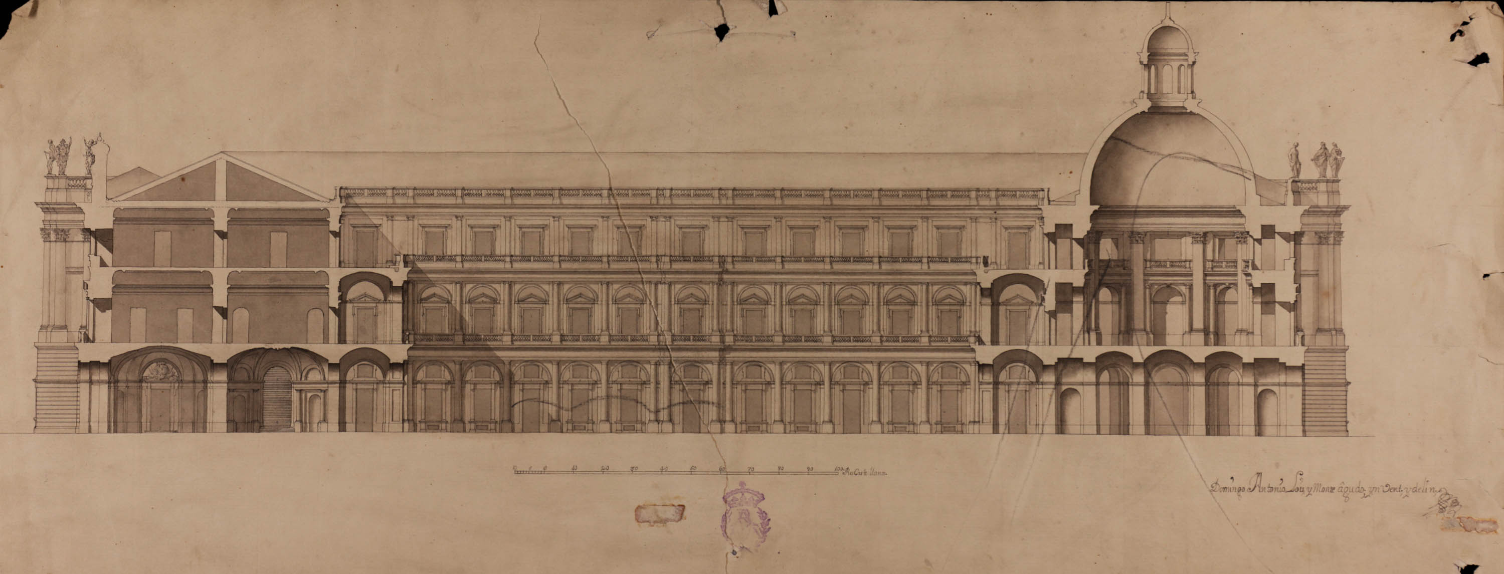 Fecha: 1754 • Nº Inventario: A-1608 • Dimensiones: 161 x 701 mm. Escala gráfica de 100 pies castellanos. • Técnica: Papel verjurado agarbanzado claro. Tinta y aguada gris.