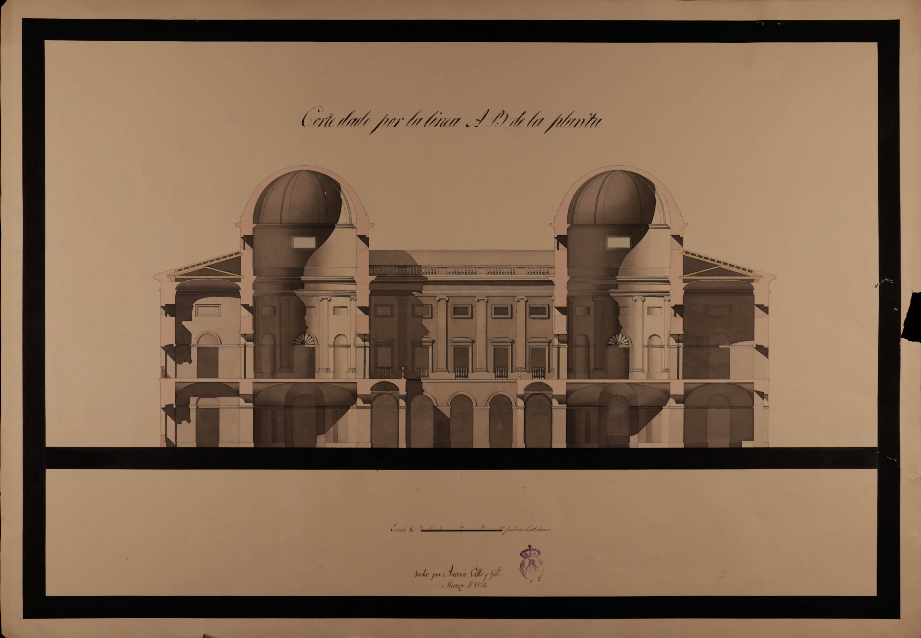 Fecha: 1832 • Nº Inventario: A-1479 • Dimensiones: 575 x 875 mm. Escala gráfica de 30 palmos catalanes. • Técnica: Papel avitelado agarbanzado claro. Tinta y aguada gris, gris azulada y rosa.