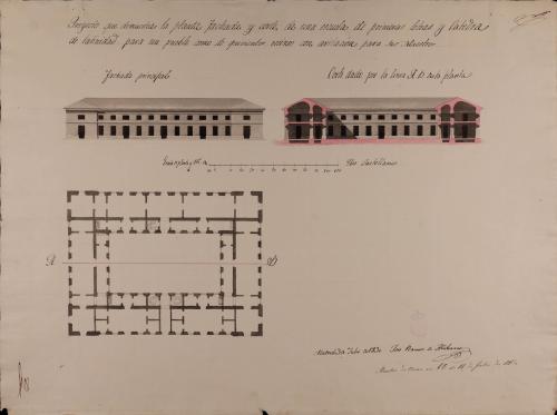 Fecha: 1830 • Nº Inventario: A-0696 • Medidas: 494 x 663 mm. Escala gráfica de 110 pies castellanos. • Técnica: Papel agarbanzado claro. Tinta y aguada gris y rosa.