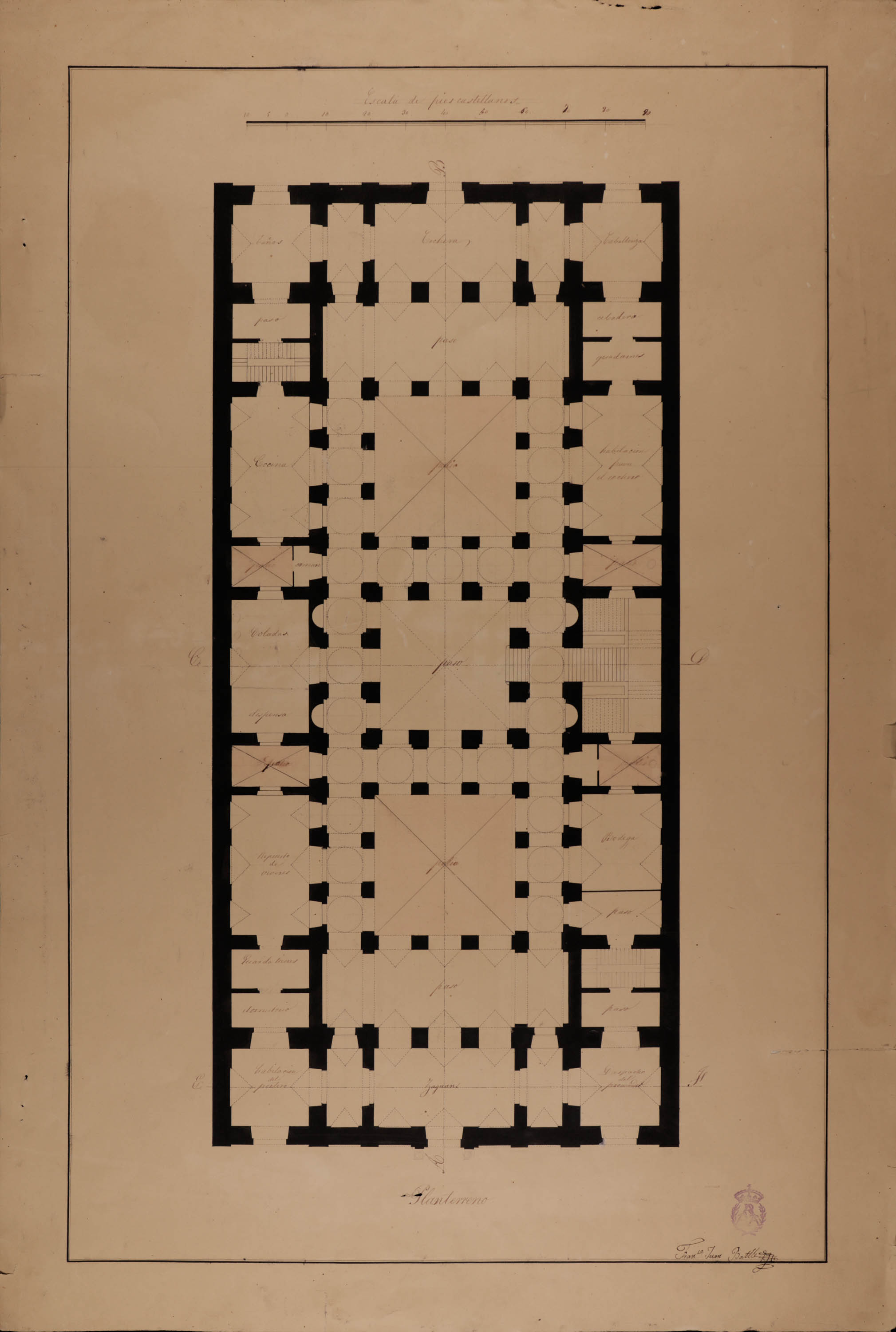 Fecha: 1836 • Nº Inventario: A-1516 • Medidas: 483 x 646 mm. Escala gráfica de 100 pies castellanos. • Técnica: Papel verjurado agarbanzado claro. Tinta y aguada gris y rosa.