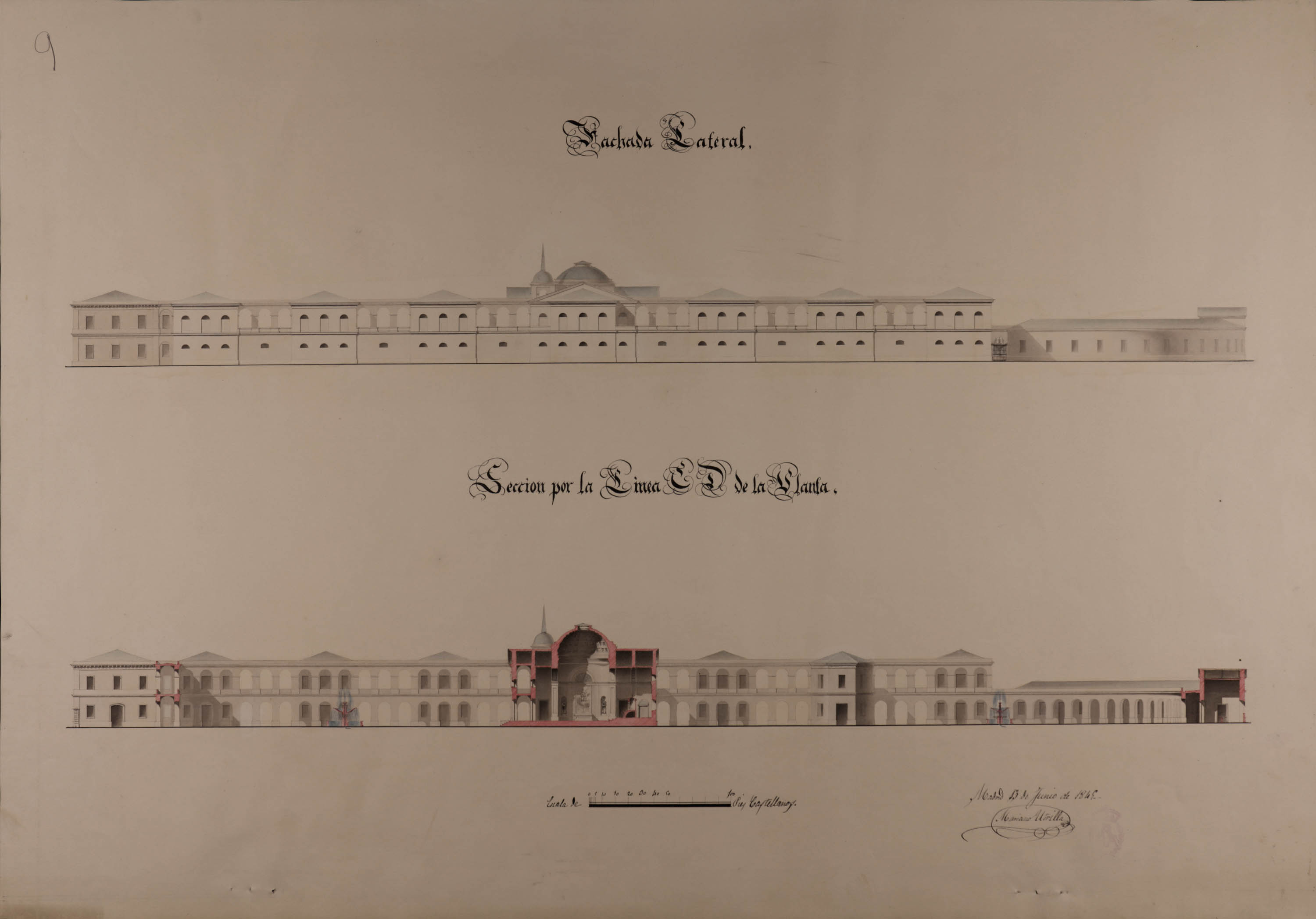 Fecha: 1845 • Nº Inventario: A-2574 • Medidas: 547 x 783 mm. Escala gráfica de 100 pies castellanos. • Técnica: Papel avitelado agarbanzado claro. Tinta y aguada gris, gris azulada y rosa.