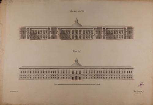 Fecha: 1832 • Nº Inventario: A-2612 • Medidas: 746 x 1063 mm. Escala gráfica de 50 metros (en italiano). • Técnica: Papel avitelado agarbanzado claro. Tinta y aguada gris, gris azulada y rosa.