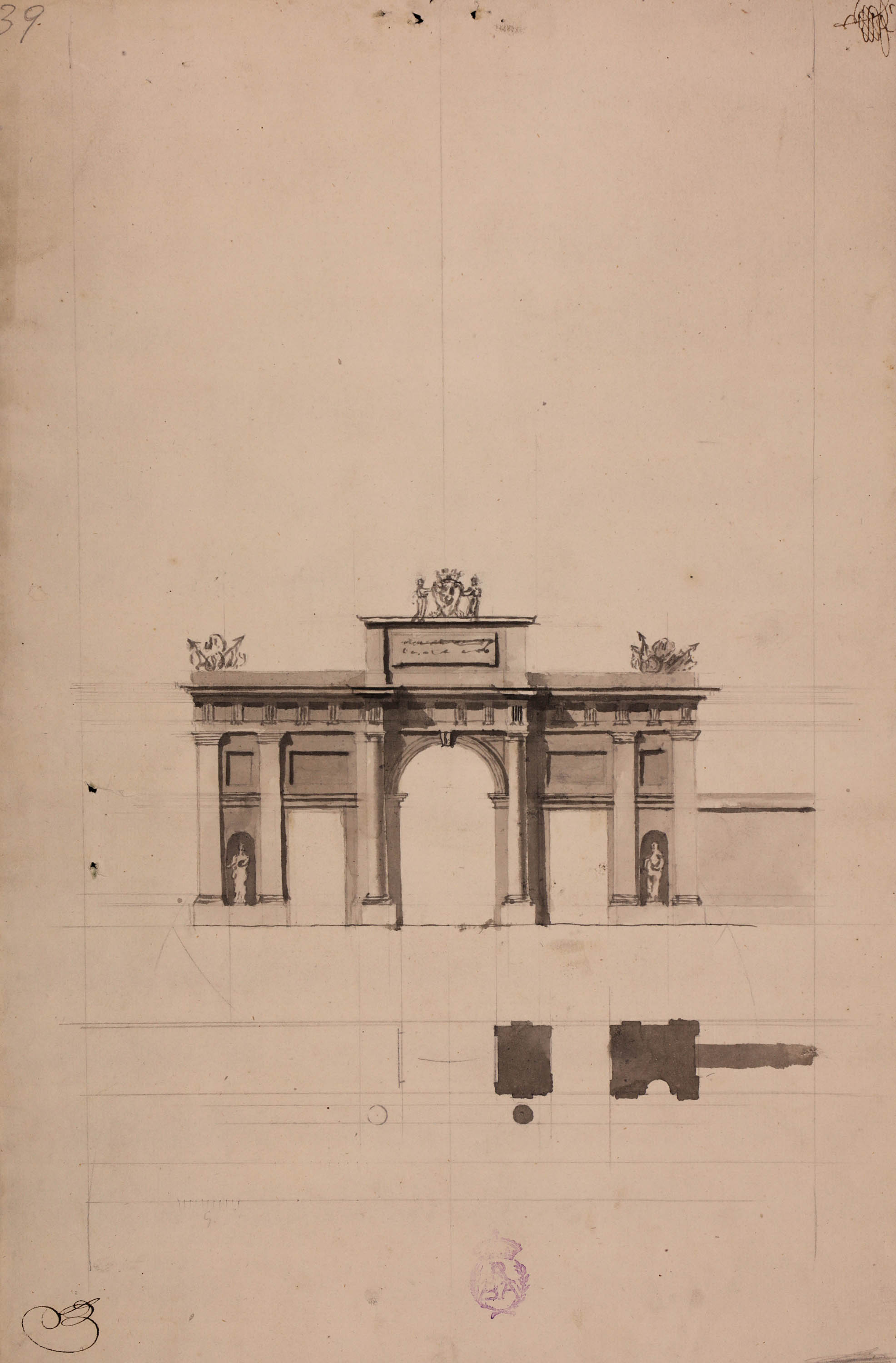 Nº Inventario: A-3496 • Medidas: 372 x 520 mm; sin escala gráfica. • Técnica: Papel verjurado ahuesado. Lápiz, tinta y aguada gris.