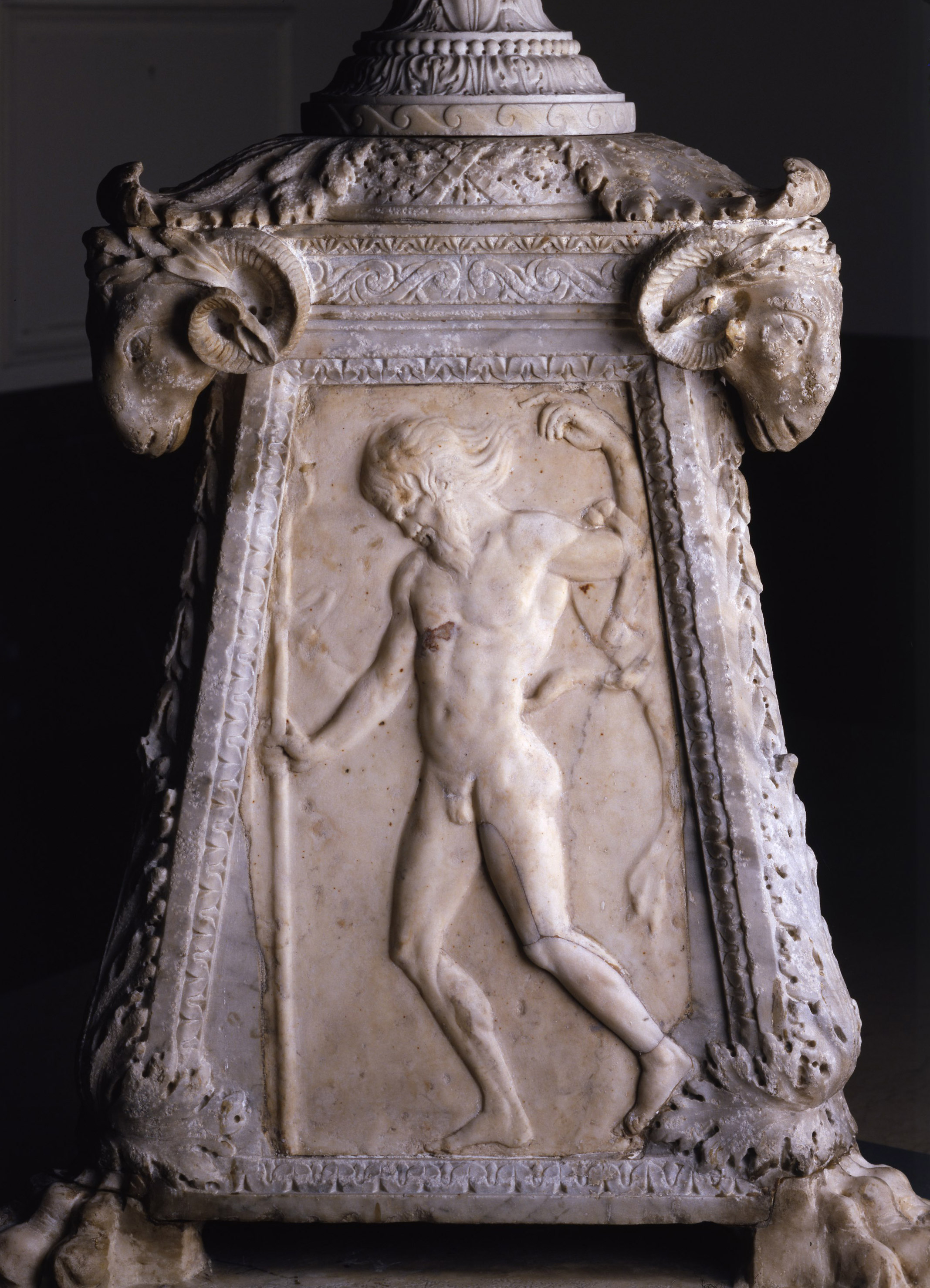 Observaciones: Base triangular con tres frentes decorados con dos relieves de estilo neoático representando una ménade y un sátiro, y con una placa con motivos vegetales en candelieri. Esta base apoya en tres garras de león y remata en otras tantas cabezas de carnero. El segundo cuerpo forma una columna abalaustrada decorada con ovas, hojas y flores en candelieri, y remata en un plato agallonado.