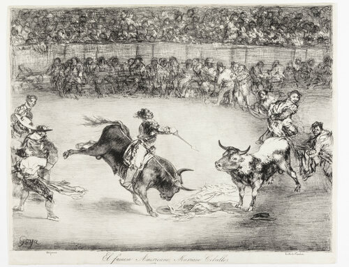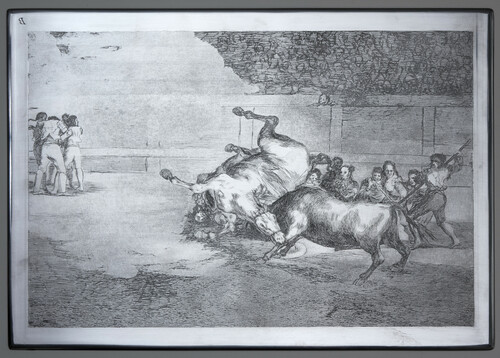 En la Tauromaquia, Goya centra su atención en los verdaderos protagonistas de la lidia, el toro y el torero, creando unas imágenes desconcertantes mediante un lenguaje de violenta intensidad. La serie, que se compró en 1979 al Círculo de Bellas Artes, consta de cuarenta estampas, aunque solo existen treinta y tres cobres, ya que siete de ellas están grabadas por las dos caras. Las estampas están relacionadas con un texto de Moratín titulado Carta histórica sobre el origen y progresos de las fiestas de toros en España, publicado en Madrid en 1777 y reeditado en 1801, y con la publicación de la segunda edición de Tauromaquia o arte de torear a caballo y a pie de Pepe Hillo, publicada con grabados, en Madrid, en 1804.