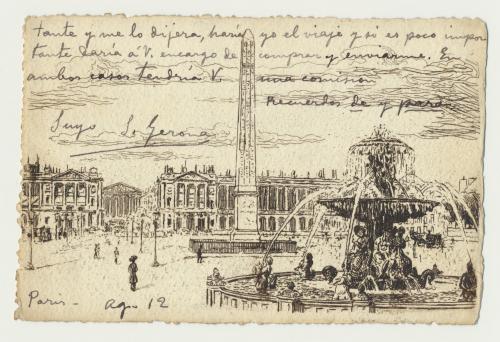 En la reverso de la postal, la imagen: tante y me lo dijera, haría/ yo el viaje y es poco impor-/tante ?aría á V. encargo de/ comprar y enviarme. EN ambos casos tendria V. / una comision/ Recuerdos de y para/ Suyo S. Gerona. //Paris-Ago 12