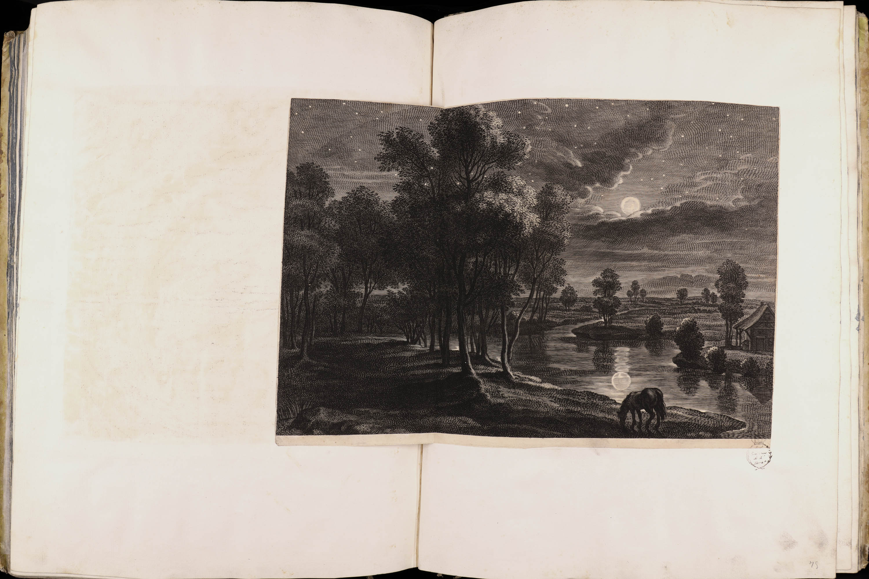 Identificación: Paisaje nocturna con claro de luna y estrellas y un caballo pastando junto a un río