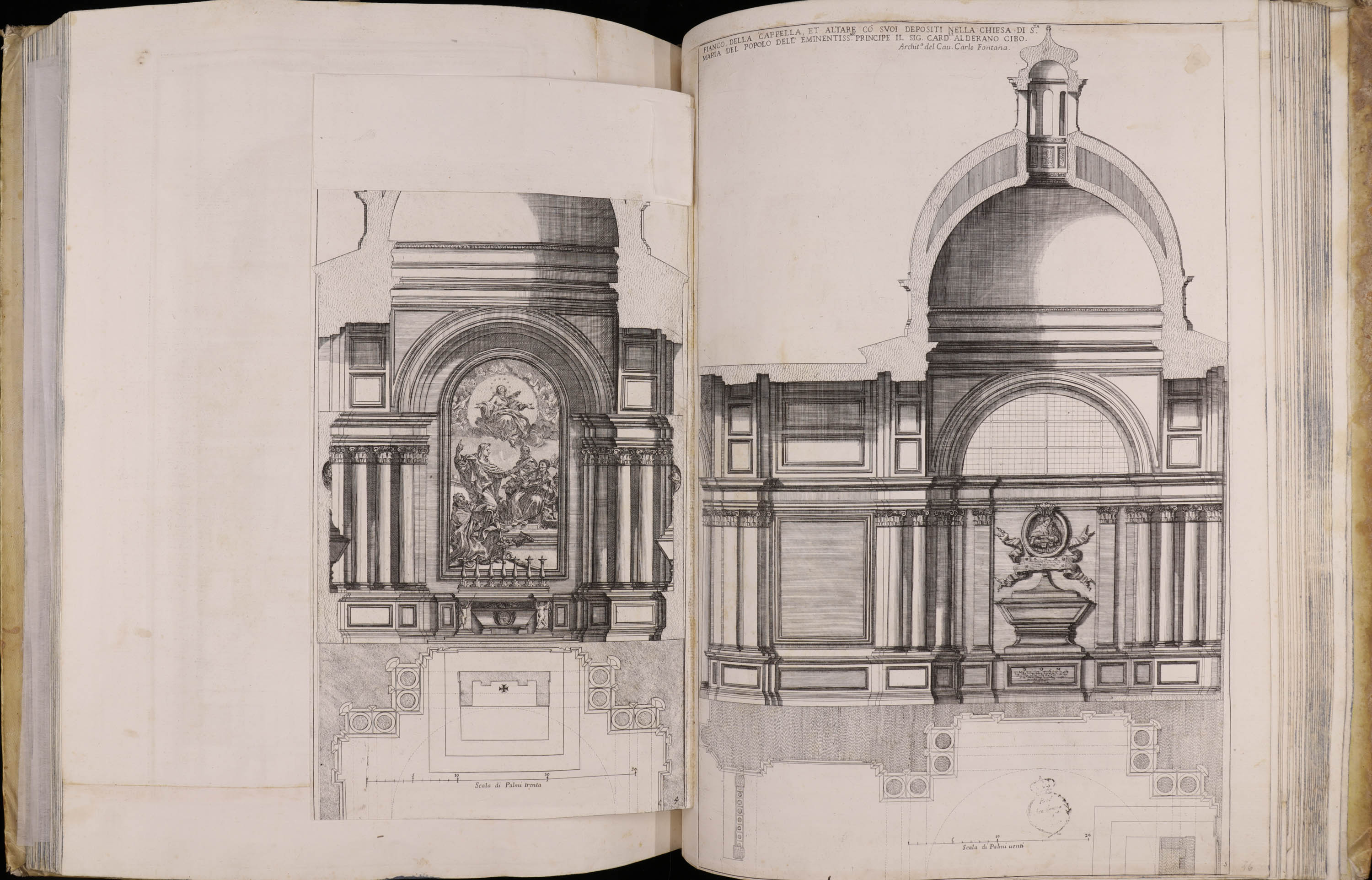 Inscripciones: En la zona superior: CAPPELLA, ET ALTARE NELLA CHIESA DI S(TA) MARIA DEL POPOLO / MAGNIFICENTISSIMAMENTE EDIFICATA ET ORNATA DI MARMI E DI PITTVRE DALL' / EMINENTISS(MO) PRINCIPE IL SIG(RE) CARDINALE ALDERANO CIBO. / Archit(a) del Cau. Carlo Fontana