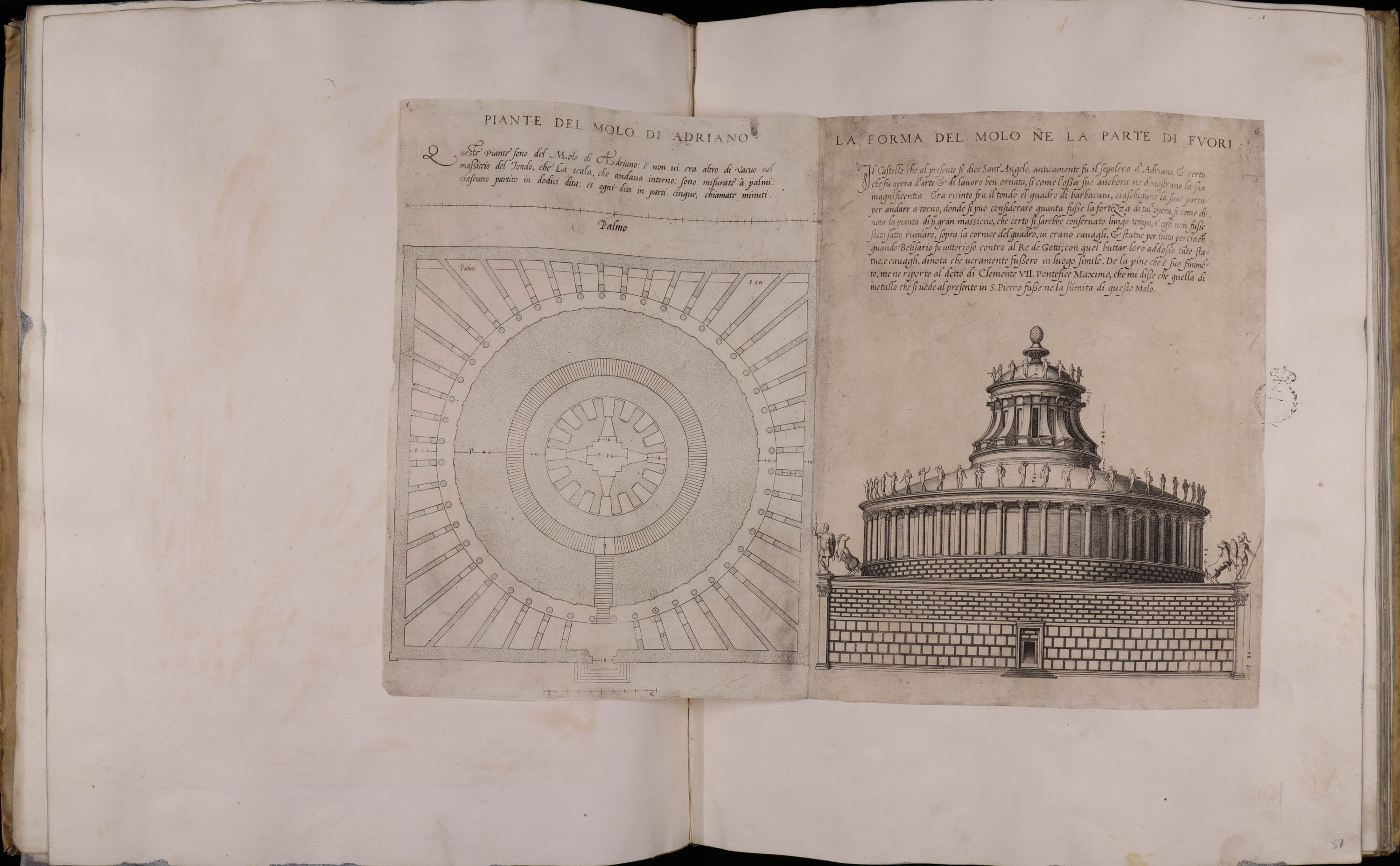 Inscripciones: En la zona superior: PIANTE DEL MOLO DI ADRIANO / Queste Piante sono del Molo di Adriano: è non ui era altro di vacuo nel / massiccio del Tondo, che la scala, che andaua intorno: sono misurate à palmi: / ciascuno partito in dodici dita: et ogni dito in parti cinque, chiamate minuti.