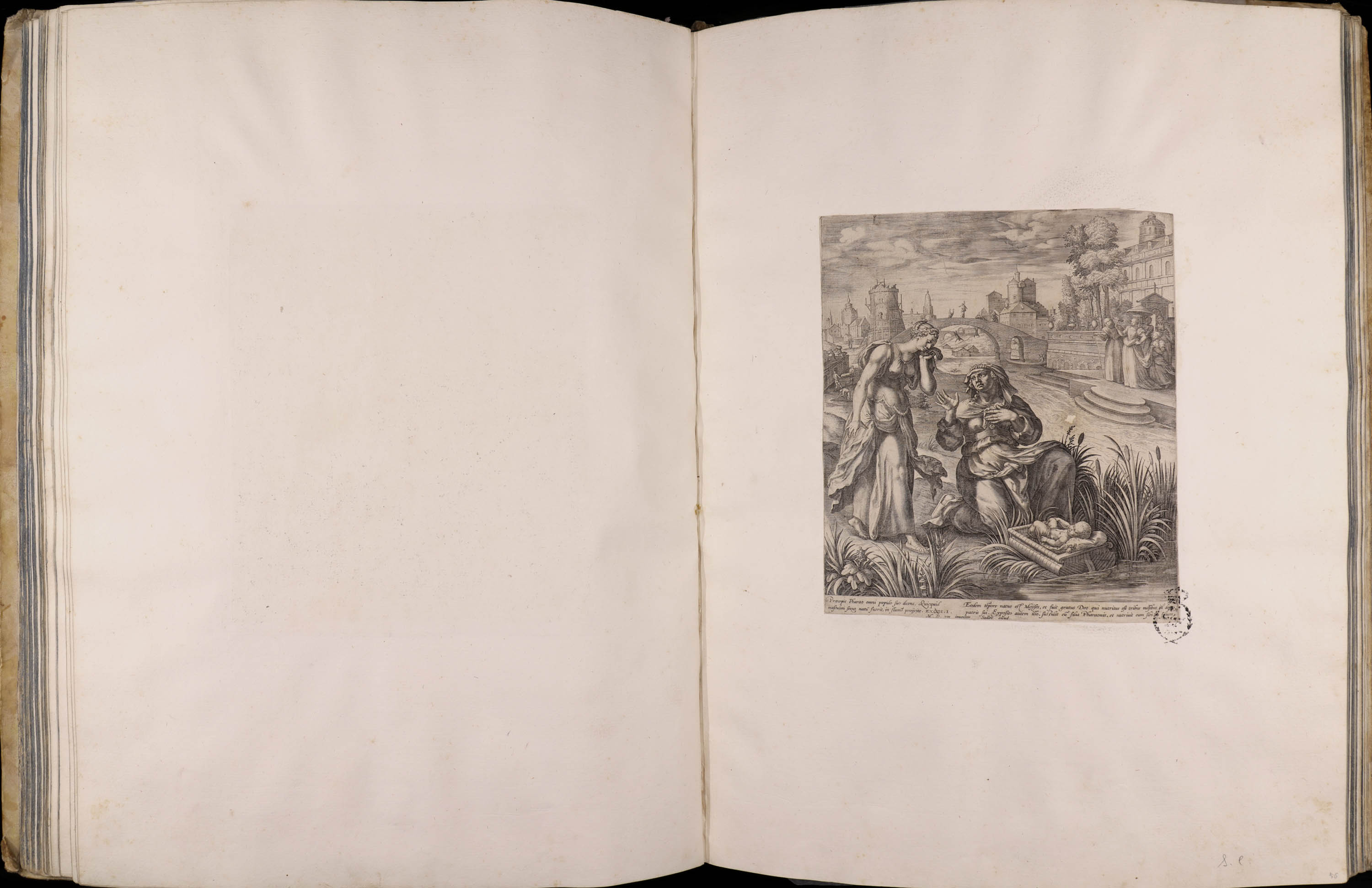 Inscripciones: Al pie: Praecepit Pharao omni populo suo dicens. Quicquid / masculini sexus natu fuerit, in flume proijcite. EXODI.I // Eodem tepore natus est Moyses, et fuit gratus Deo qui nutritus est tribus mesibus in domo / patris sui. Exposito autem illo, sustulit eis filia Pharaonis, et nutriuit eum sibi in filium.