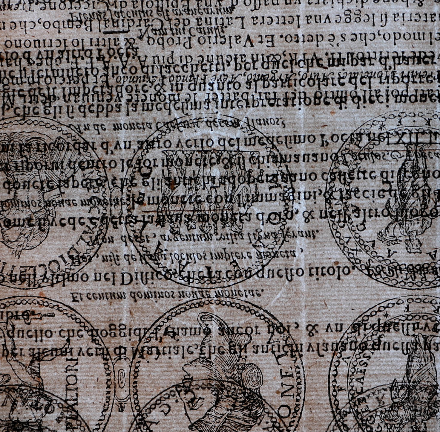 Segunda edición italiana que reproduce en realidad la primera edición de Roma de 1592 (impresa por Guglielmo Faciotto), cuyo principal responsable y traductor fue Dionigi Ottaviano Sada, de origen español, quien acrecentó respecto a la editio princeps española (Tarragona, 1587), con nuevos grabados xilográficos de monedas a partir de su propia colección numismática, así como de las de Fulvio Orsini, Lelio Pasqualini, Giovanni Battista della Porta y el P. Alfonso Chacón, como señala en la advertencia preliminar al lector. En 1592 aparecieron otras dos traducciones italianas anónimas más editadas, una en Roma por Ascanio y Girolamo Donangeli y otra en Venecia, que nunca fueron reeditadas.