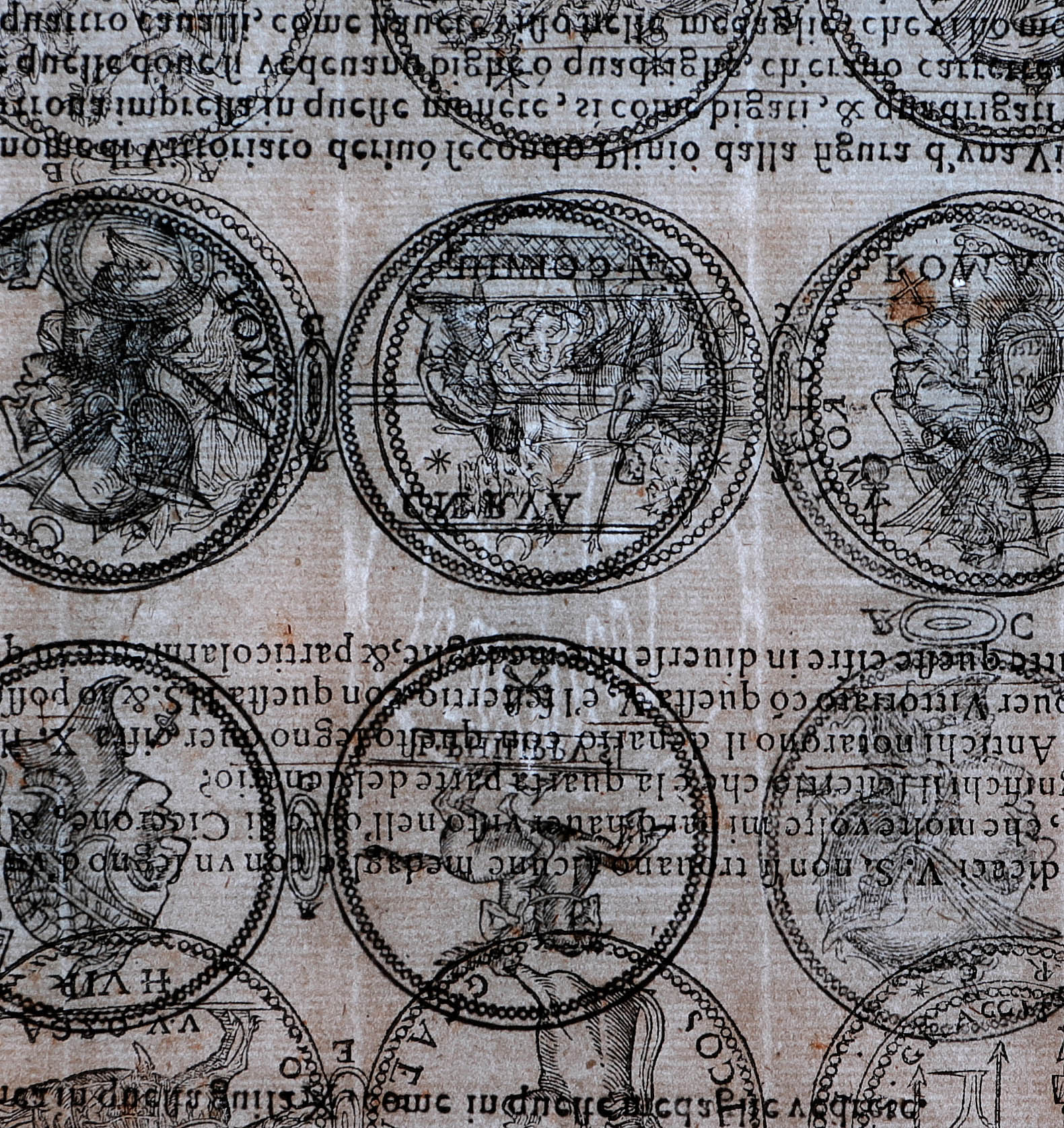 Segunda edición italiana que reproduce en realidad la primera edición de Roma de 1592 (impresa por Guglielmo Faciotto), cuyo principal responsable y traductor fue Dionigi Ottaviano Sada, de origen español, quien acrecentó respecto a la editio princeps española (Tarragona, 1587), con nuevos grabados xilográficos de monedas a partir de su propia colección numismática, así como de las de Fulvio Orsini, Lelio Pasqualini, Giovanni Battista della Porta y el P. Alfonso Chacón, como señala en la advertencia preliminar al lector. En 1592 aparecieron otras dos traducciones italianas anónimas más editadas, una en Roma por Ascanio y Girolamo Donangeli y otra en Venecia, que nunca fueron reeditadas.