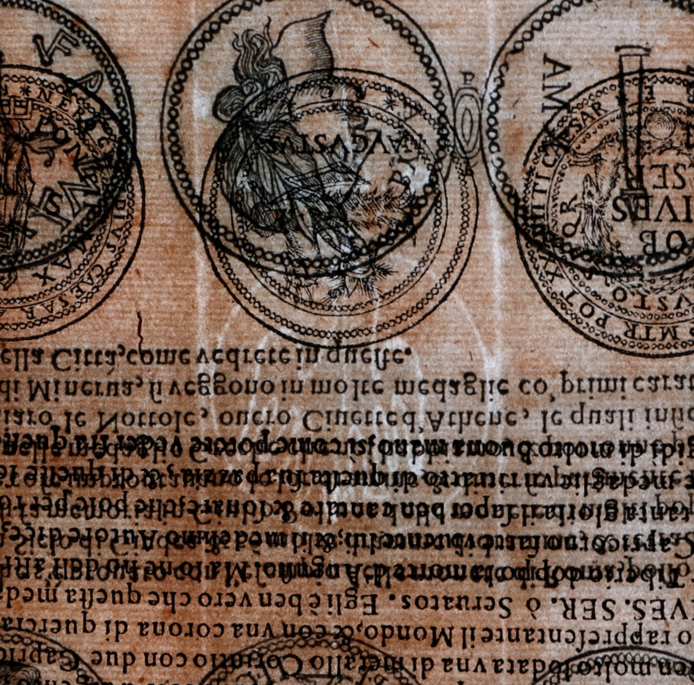 Segunda edición italiana que reproduce en realidad la primera edición de Roma de 1592 (impresa por Guglielmo Faciotto), cuyo principal responsable y traductor fue Dionigi Ottaviano Sada, de origen español, quien acrecentó respecto a la editio princeps española (Tarragona, 1587), con nuevos grabados xilográficos de monedas a partir de su propia colección numismática, así como de las de Fulvio Orsini, Lelio Pasqualini, Giovanni Battista della Porta y el P. Alfonso Chacón, como señala en la advertencia preliminar al lector. En 1592 aparecieron otras dos traducciones italianas anónimas más editadas, una en Roma por Ascanio y Girolamo Donangeli y otra en Venecia, que nunca fueron reeditadas.
