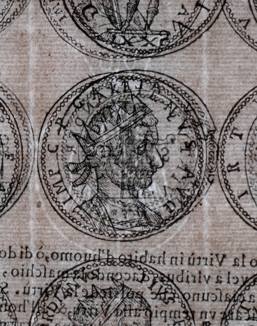 Segunda edición italiana que reproduce en realidad la primera edición de Roma de 1592 (impresa por Guglielmo Faciotto), cuyo principal responsable y traductor fue Dionigi Ottaviano Sada, de origen español, quien acrecentó respecto a la editio princeps española (Tarragona, 1587), con nuevos grabados xilográficos de monedas a partir de su propia colección numismática, así como de las de Fulvio Orsini, Lelio Pasqualini, Giovanni Battista della Porta y el P. Alfonso Chacón, como señala en la advertencia preliminar al lector. En 1592 aparecieron otras dos traducciones italianas anónimas más editadas, una en Roma por Ascanio y Girolamo Donangeli y otra en Venecia, que nunca fueron reeditadas.