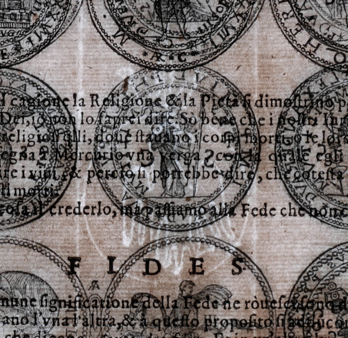 Segunda edición italiana que reproduce en realidad la primera edición de Roma de 1592 (impresa por Guglielmo Faciotto), cuyo principal responsable y traductor fue Dionigi Ottaviano Sada, de origen español, quien acrecentó respecto a la editio princeps española (Tarragona, 1587), con nuevos grabados xilográficos de monedas a partir de su propia colección numismática, así como de las de Fulvio Orsini, Lelio Pasqualini, Giovanni Battista della Porta y el P. Alfonso Chacón, como señala en la advertencia preliminar al lector. En 1592 aparecieron otras dos traducciones italianas anónimas más editadas, una en Roma por Ascanio y Girolamo Donangeli y otra en Venecia, que nunca fueron reeditadas.