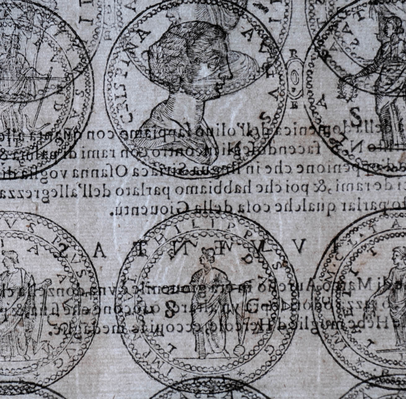 Segunda edición italiana que reproduce en realidad la primera edición de Roma de 1592 (impresa por Guglielmo Faciotto), cuyo principal responsable y traductor fue Dionigi Ottaviano Sada, de origen español, quien acrecentó respecto a la editio princeps española (Tarragona, 1587), con nuevos grabados xilográficos de monedas a partir de su propia colección numismática, así como de las de Fulvio Orsini, Lelio Pasqualini, Giovanni Battista della Porta y el P. Alfonso Chacón, como señala en la advertencia preliminar al lector. En 1592 aparecieron otras dos traducciones italianas anónimas más editadas, una en Roma por Ascanio y Girolamo Donangeli y otra en Venecia, que nunca fueron reeditadas.