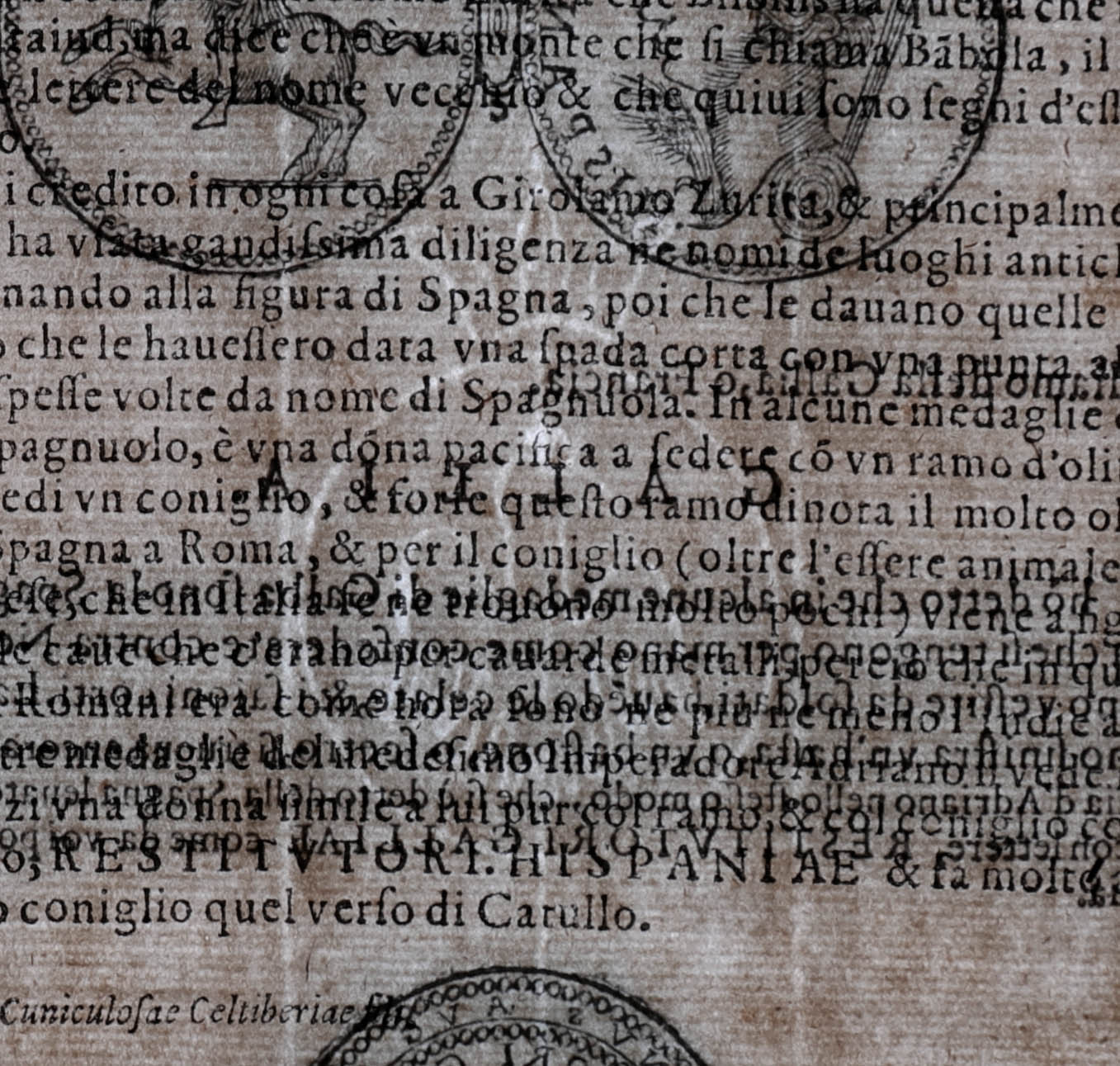 Segunda edición italiana que reproduce en realidad la primera edición de Roma de 1592 (impresa por Guglielmo Faciotto), cuyo principal responsable y traductor fue Dionigi Ottaviano Sada, de origen español, quien acrecentó respecto a la editio princeps española (Tarragona, 1587), con nuevos grabados xilográficos de monedas a partir de su propia colección numismática, así como de las de Fulvio Orsini, Lelio Pasqualini, Giovanni Battista della Porta y el P. Alfonso Chacón, como señala en la advertencia preliminar al lector. En 1592 aparecieron otras dos traducciones italianas anónimas más editadas, una en Roma por Ascanio y Girolamo Donangeli y otra en Venecia, que nunca fueron reeditadas.