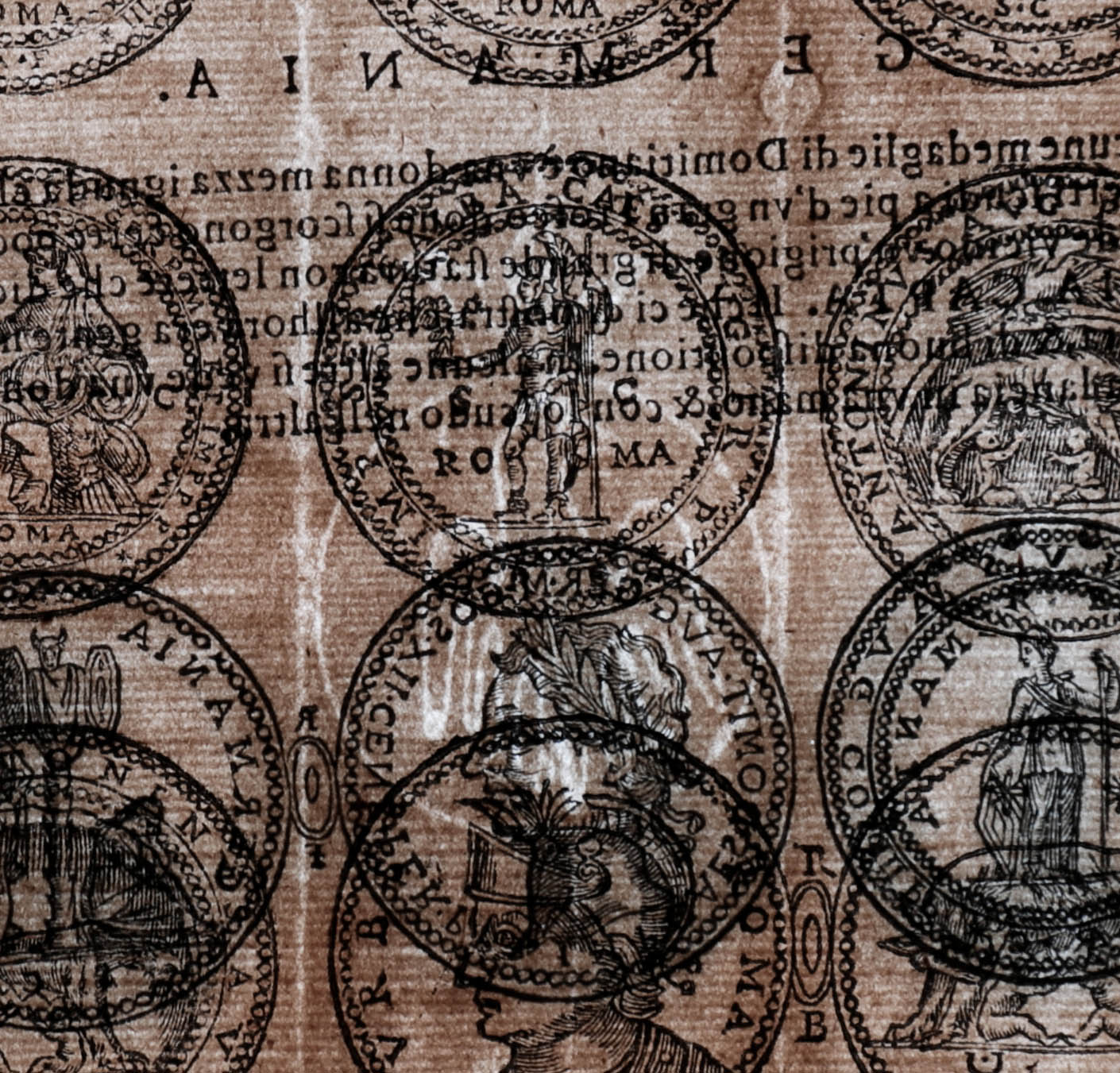 Segunda edición italiana que reproduce en realidad la primera edición de Roma de 1592 (impresa por Guglielmo Faciotto), cuyo principal responsable y traductor fue Dionigi Ottaviano Sada, de origen español, quien acrecentó respecto a la editio princeps española (Tarragona, 1587), con nuevos grabados xilográficos de monedas a partir de su propia colección numismática, así como de las de Fulvio Orsini, Lelio Pasqualini, Giovanni Battista della Porta y el P. Alfonso Chacón, como señala en la advertencia preliminar al lector. En 1592 aparecieron otras dos traducciones italianas anónimas más editadas, una en Roma por Ascanio y Girolamo Donangeli y otra en Venecia, que nunca fueron reeditadas.