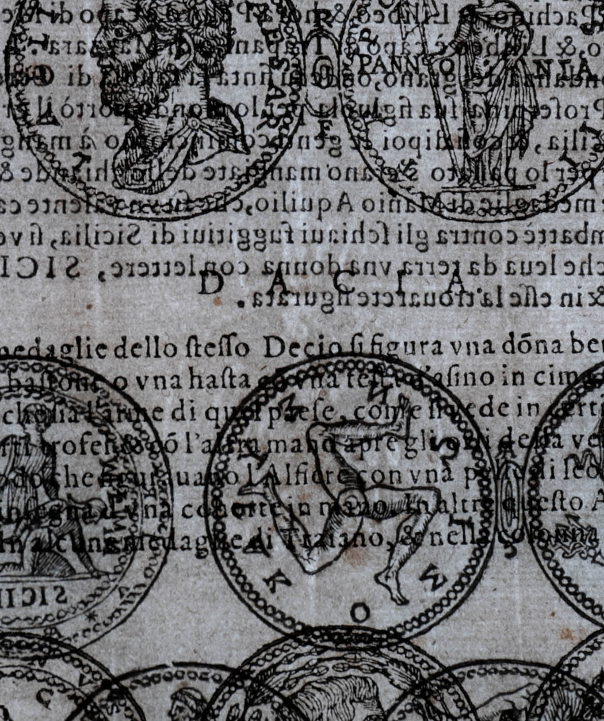 Segunda edición italiana que reproduce en realidad la primera edición de Roma de 1592 (impresa por Guglielmo Faciotto), cuyo principal responsable y traductor fue Dionigi Ottaviano Sada, de origen español, quien acrecentó respecto a la editio princeps española (Tarragona, 1587), con nuevos grabados xilográficos de monedas a partir de su propia colección numismática, así como de las de Fulvio Orsini, Lelio Pasqualini, Giovanni Battista della Porta y el P. Alfonso Chacón, como señala en la advertencia preliminar al lector. En 1592 aparecieron otras dos traducciones italianas anónimas más editadas, una en Roma por Ascanio y Girolamo Donangeli y otra en Venecia, que nunca fueron reeditadas.