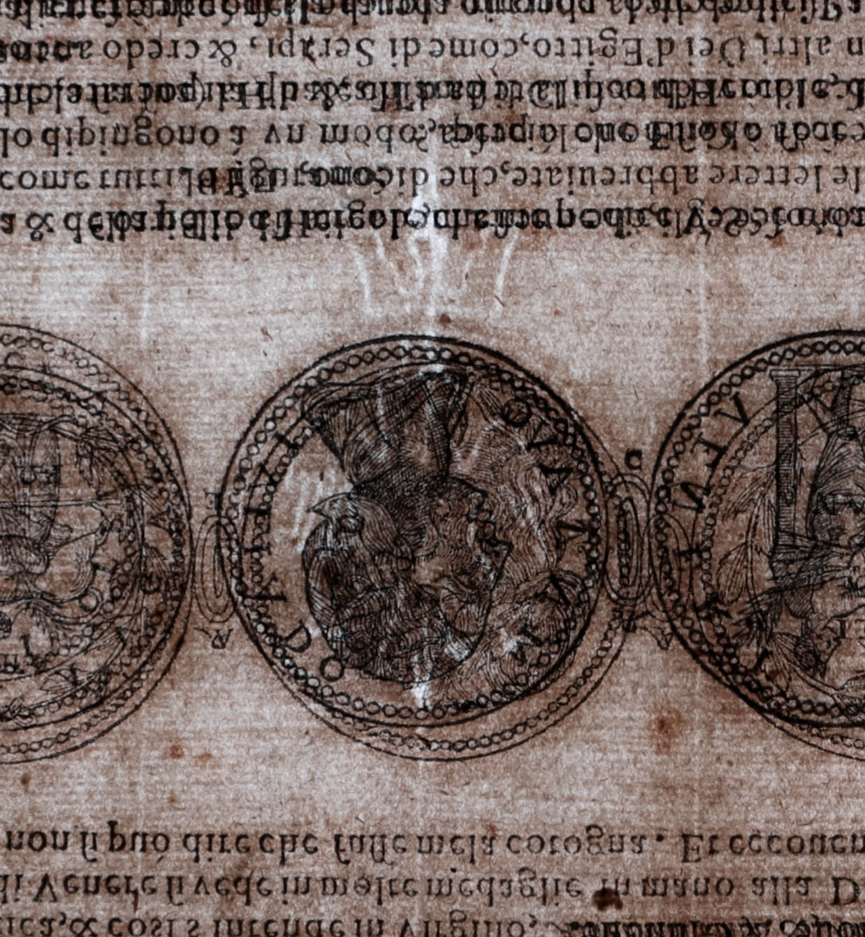 Segunda edición italiana que reproduce en realidad la primera edición de Roma de 1592 (impresa por Guglielmo Faciotto), cuyo principal responsable y traductor fue Dionigi Ottaviano Sada, de origen español, quien acrecentó respecto a la editio princeps española (Tarragona, 1587), con nuevos grabados xilográficos de monedas a partir de su propia colección numismática, así como de las de Fulvio Orsini, Lelio Pasqualini, Giovanni Battista della Porta y el P. Alfonso Chacón, como señala en la advertencia preliminar al lector. En 1592 aparecieron otras dos traducciones italianas anónimas más editadas, una en Roma por Ascanio y Girolamo Donangeli y otra en Venecia, que nunca fueron reeditadas.