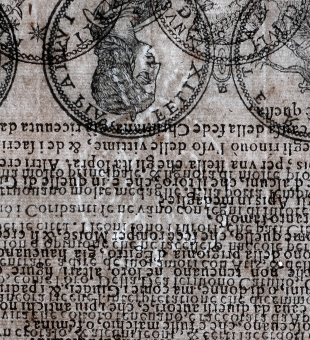 Segunda edición italiana que reproduce en realidad la primera edición de Roma de 1592 (impresa por Guglielmo Faciotto), cuyo principal responsable y traductor fue Dionigi Ottaviano Sada, de origen español, quien acrecentó respecto a la editio princeps española (Tarragona, 1587), con nuevos grabados xilográficos de monedas a partir de su propia colección numismática, así como de las de Fulvio Orsini, Lelio Pasqualini, Giovanni Battista della Porta y el P. Alfonso Chacón, como señala en la advertencia preliminar al lector. En 1592 aparecieron otras dos traducciones italianas anónimas más editadas, una en Roma por Ascanio y Girolamo Donangeli y otra en Venecia, que nunca fueron reeditadas.