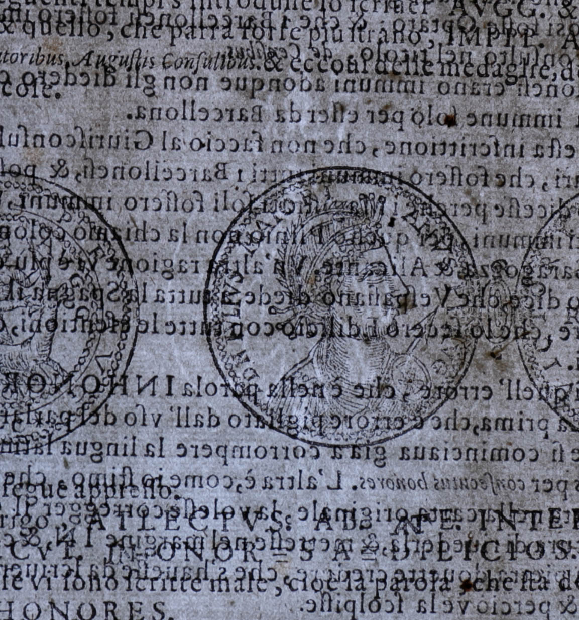 Segunda edición italiana que reproduce en realidad la primera edición de Roma de 1592 (impresa por Guglielmo Faciotto), cuyo principal responsable y traductor fue Dionigi Ottaviano Sada, de origen español, quien acrecentó respecto a la editio princeps española (Tarragona, 1587), con nuevos grabados xilográficos de monedas a partir de su propia colección numismática, así como de las de Fulvio Orsini, Lelio Pasqualini, Giovanni Battista della Porta y el P. Alfonso Chacón, como señala en la advertencia preliminar al lector. En 1592 aparecieron otras dos traducciones italianas anónimas más editadas, una en Roma por Ascanio y Girolamo Donangeli y otra en Venecia, que nunca fueron reeditadas.
