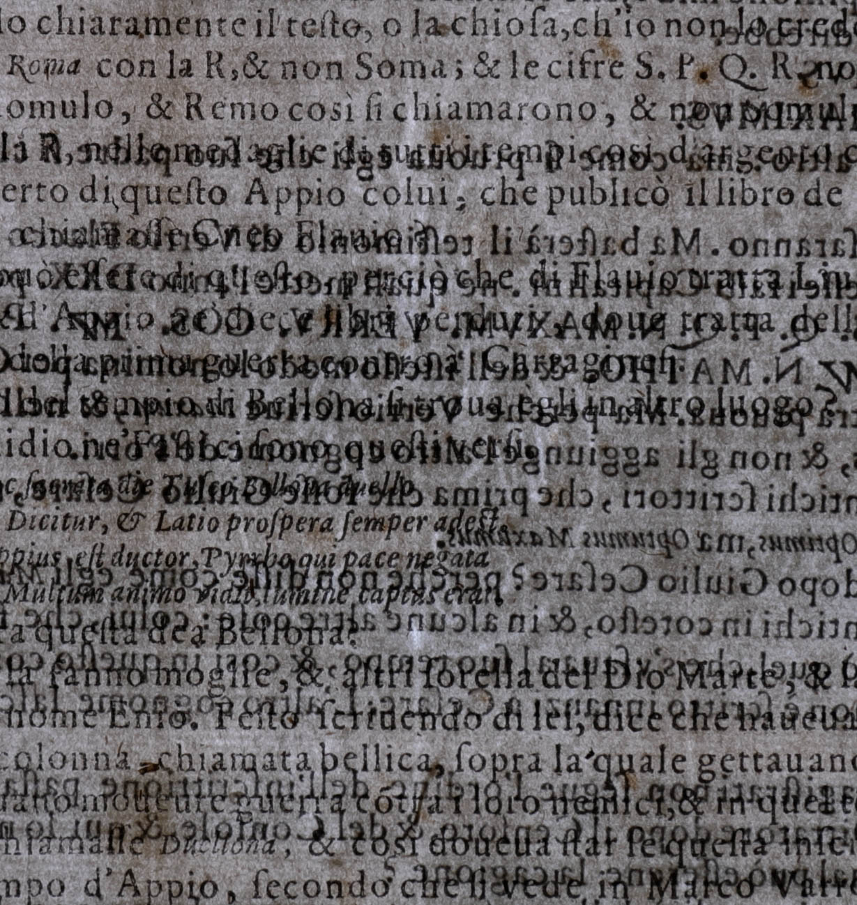 Segunda edición italiana que reproduce en realidad la primera edición de Roma de 1592 (impresa por Guglielmo Faciotto), cuyo principal responsable y traductor fue Dionigi Ottaviano Sada, de origen español, quien acrecentó respecto a la editio princeps española (Tarragona, 1587), con nuevos grabados xilográficos de monedas a partir de su propia colección numismática, así como de las de Fulvio Orsini, Lelio Pasqualini, Giovanni Battista della Porta y el P. Alfonso Chacón, como señala en la advertencia preliminar al lector. En 1592 aparecieron otras dos traducciones italianas anónimas más editadas, una en Roma por Ascanio y Girolamo Donangeli y otra en Venecia, que nunca fueron reeditadas.