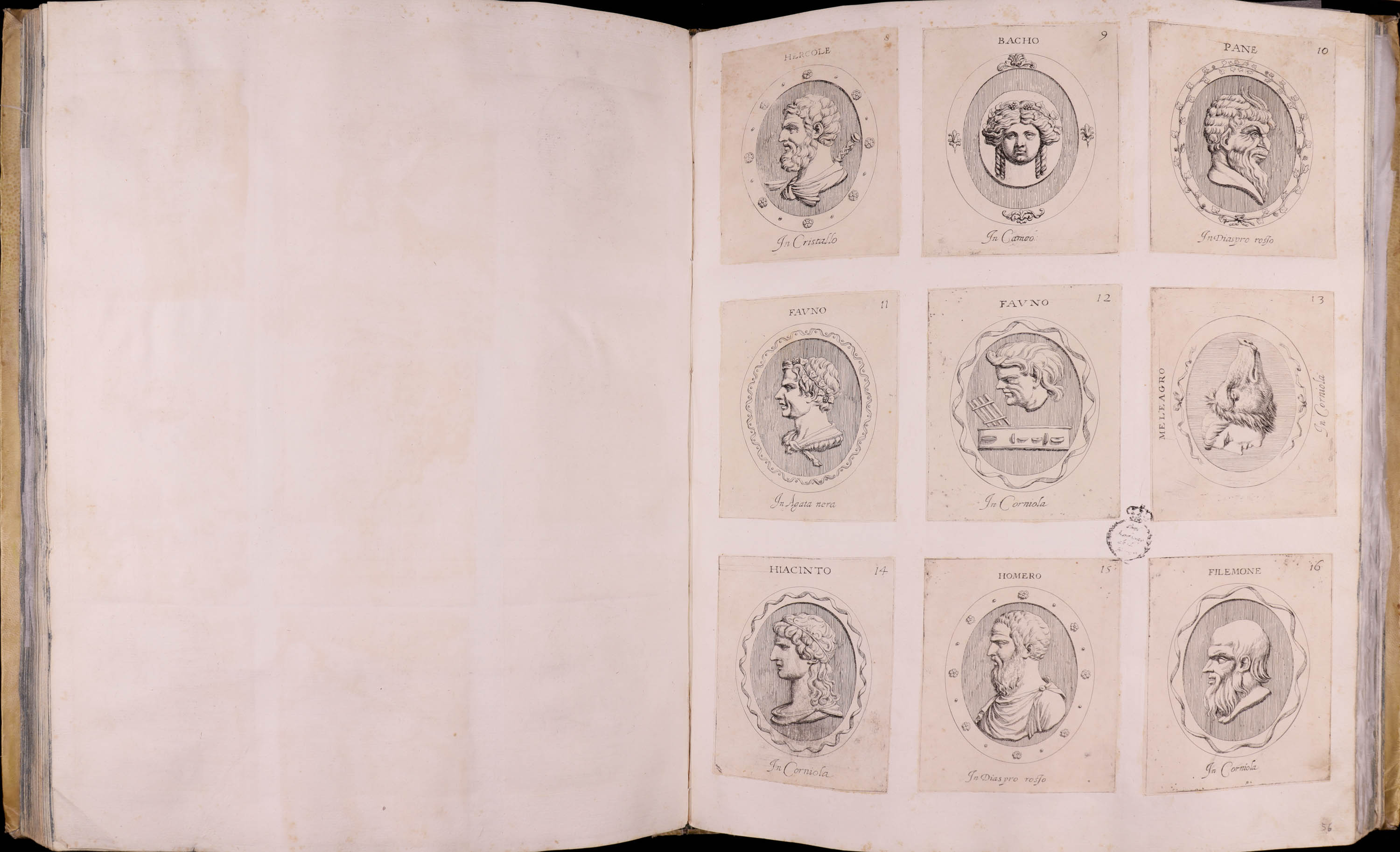Primera edición del primer volumen de dos (incompleto, faltan las primeras hojas de la dedicatoria al papa Alejandro VII, advertencia al lector e índice de las láminas), que recoge la colección de camafeos y gemas del cardenal Francesco Barberini en 214 aguafuertes.