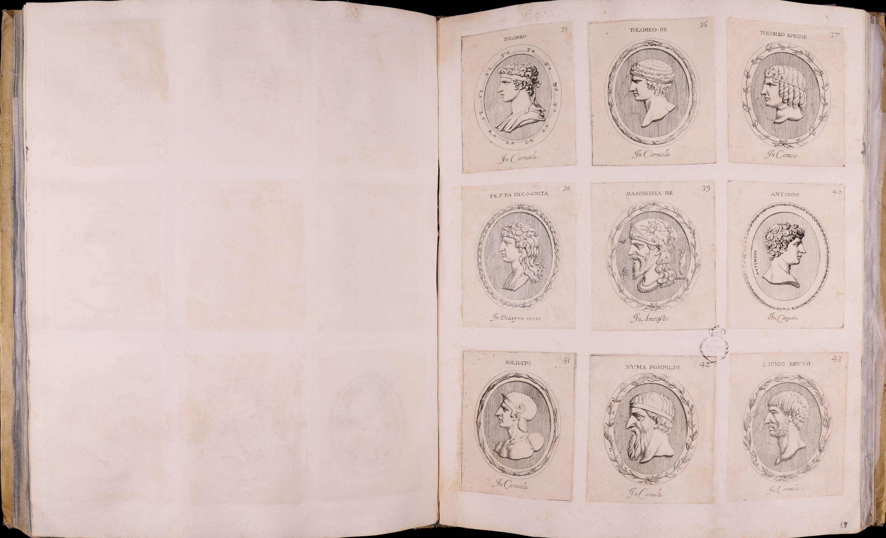 Primera edición del primer volumen de dos (incompleto, faltan las primeras hojas de la dedicatoria al papa Alejandro VII, advertencia al lector e índice de las láminas), que recoge la colección de camafeos y gemas del cardenal Francesco Barberini en 214 aguafuertes.