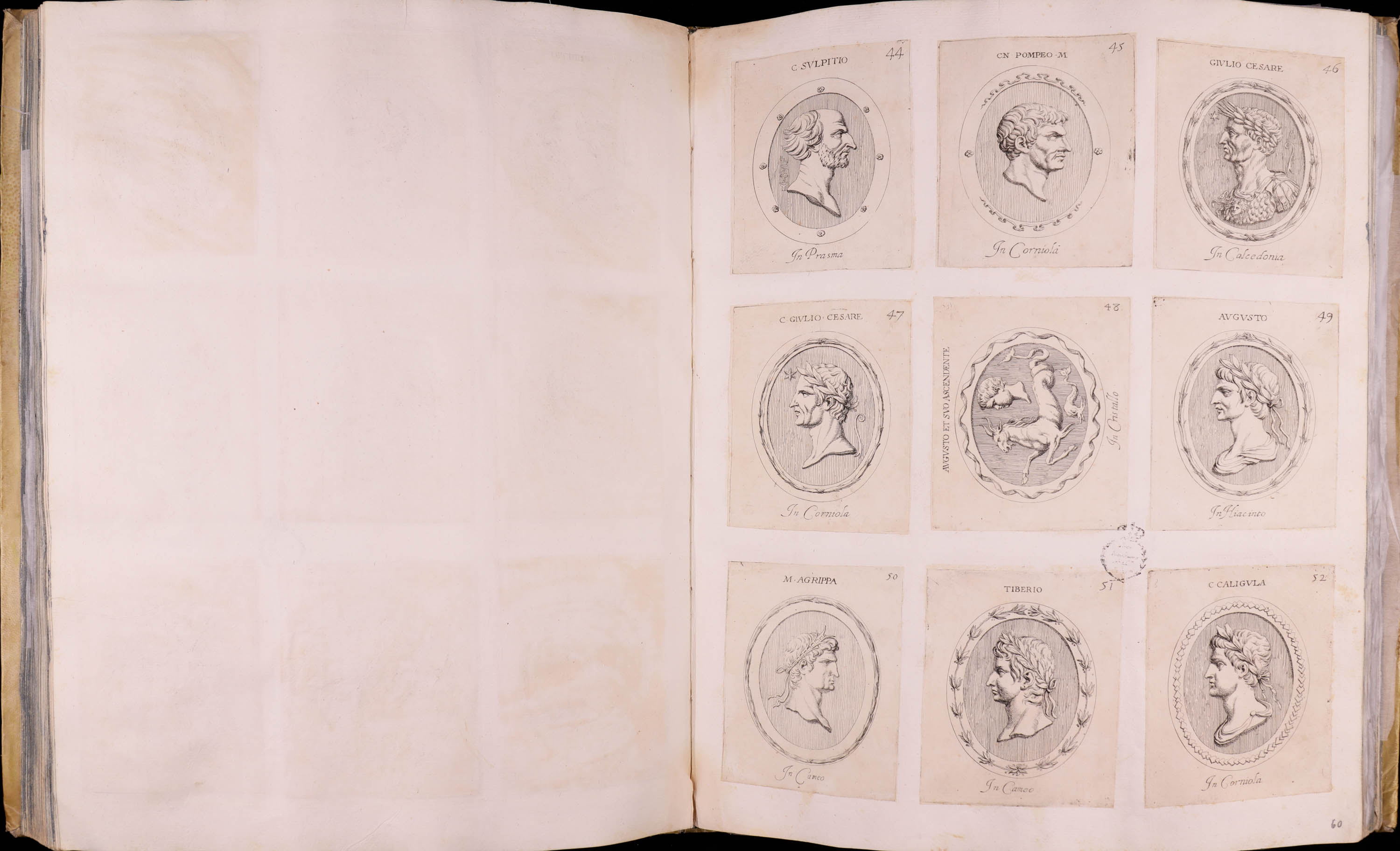 Primera edición del primer volumen de dos (incompleto, faltan las primeras hojas de la dedicatoria al papa Alejandro VII, advertencia al lector e índice de las láminas), que recoge la colección de camafeos y gemas del cardenal Francesco Barberini en 214 aguafuertes.