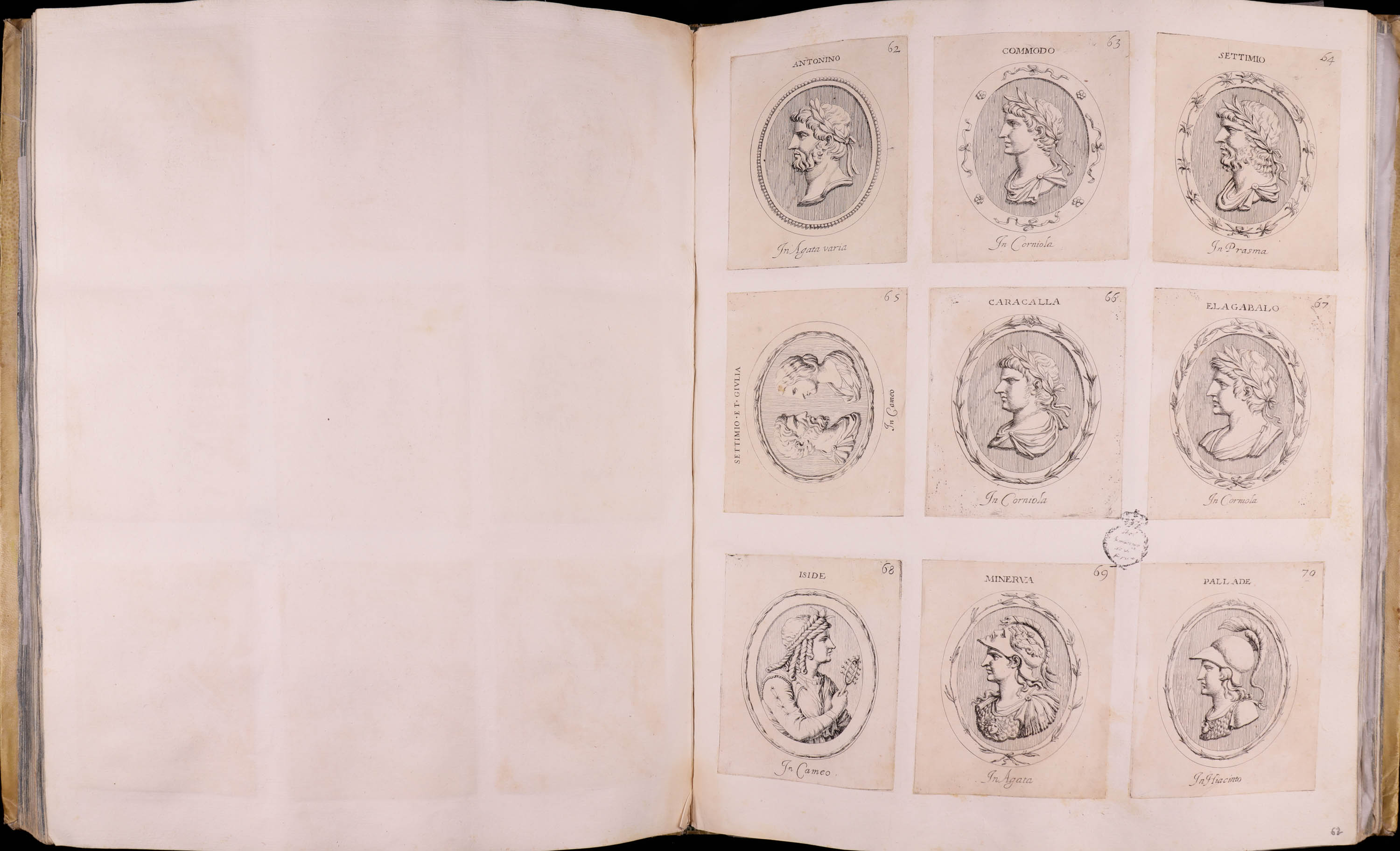 Primera edición del primer volumen de dos (incompleto, faltan las primeras hojas de la dedicatoria al papa Alejandro VII, advertencia al lector e índice de las láminas), que recoge la colección de camafeos y gemas del cardenal Francesco Barberini en 214 aguafuertes.