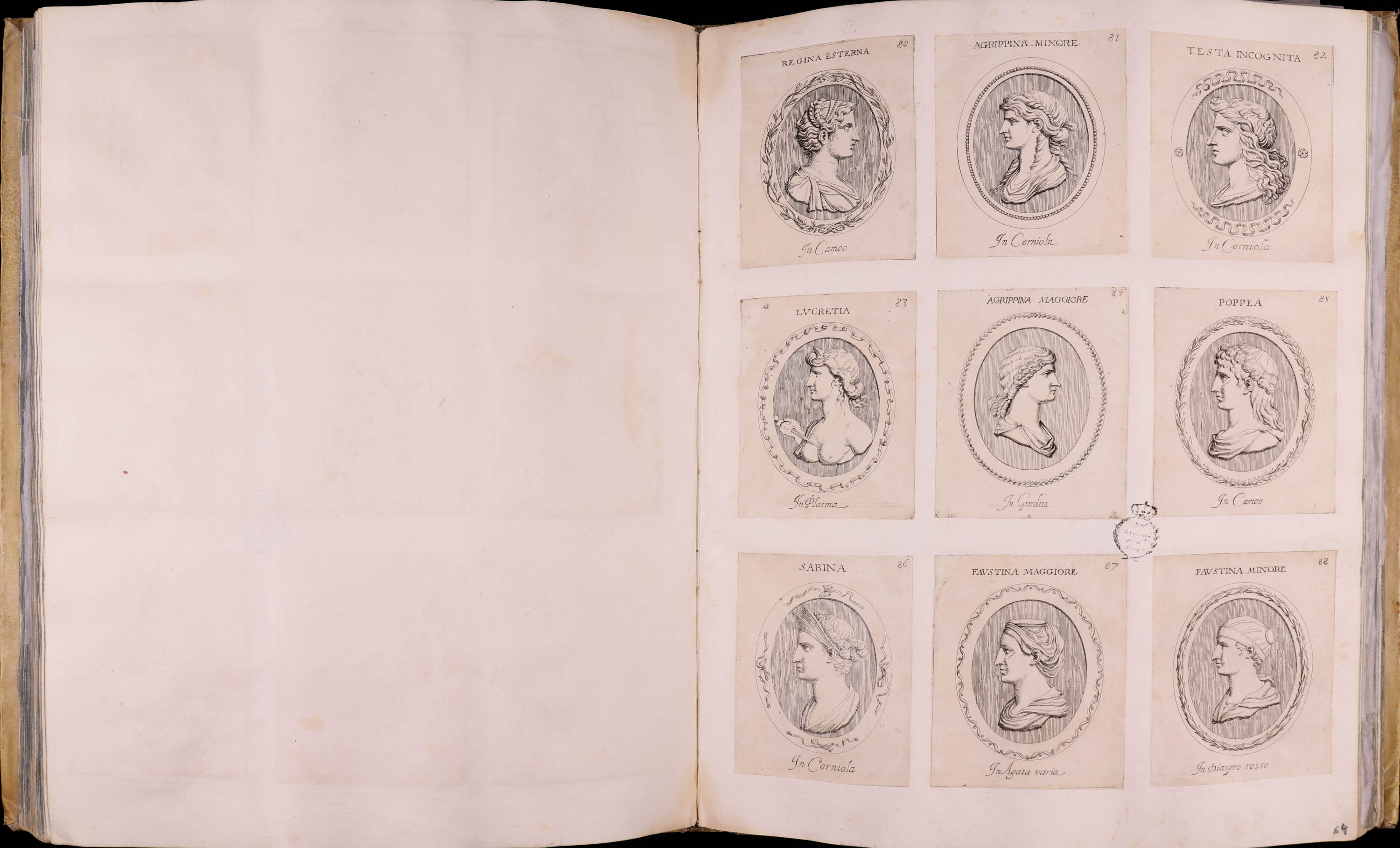 Primera edición del primer volumen de dos (incompleto, faltan las primeras hojas de la dedicatoria al papa Alejandro VII, advertencia al lector e índice de las láminas), que recoge la colección de camafeos y gemas del cardenal Francesco Barberini en 214 aguafuertes.