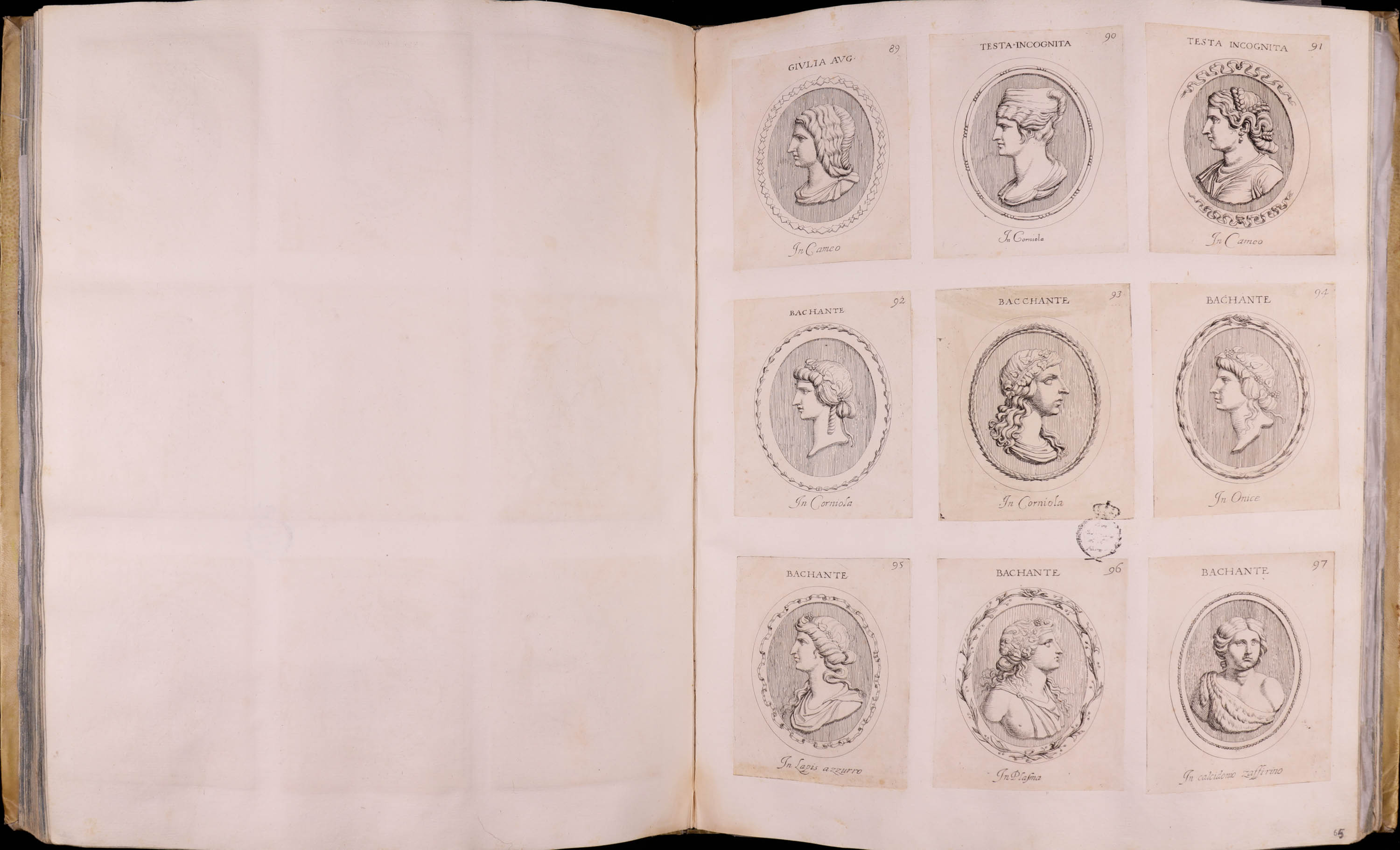 Primera edición del primer volumen de dos (incompleto, faltan las primeras hojas de la dedicatoria al papa Alejandro VII, advertencia al lector e índice de las láminas), que recoge la colección de camafeos y gemas del cardenal Francesco Barberini en 214 aguafuertes.