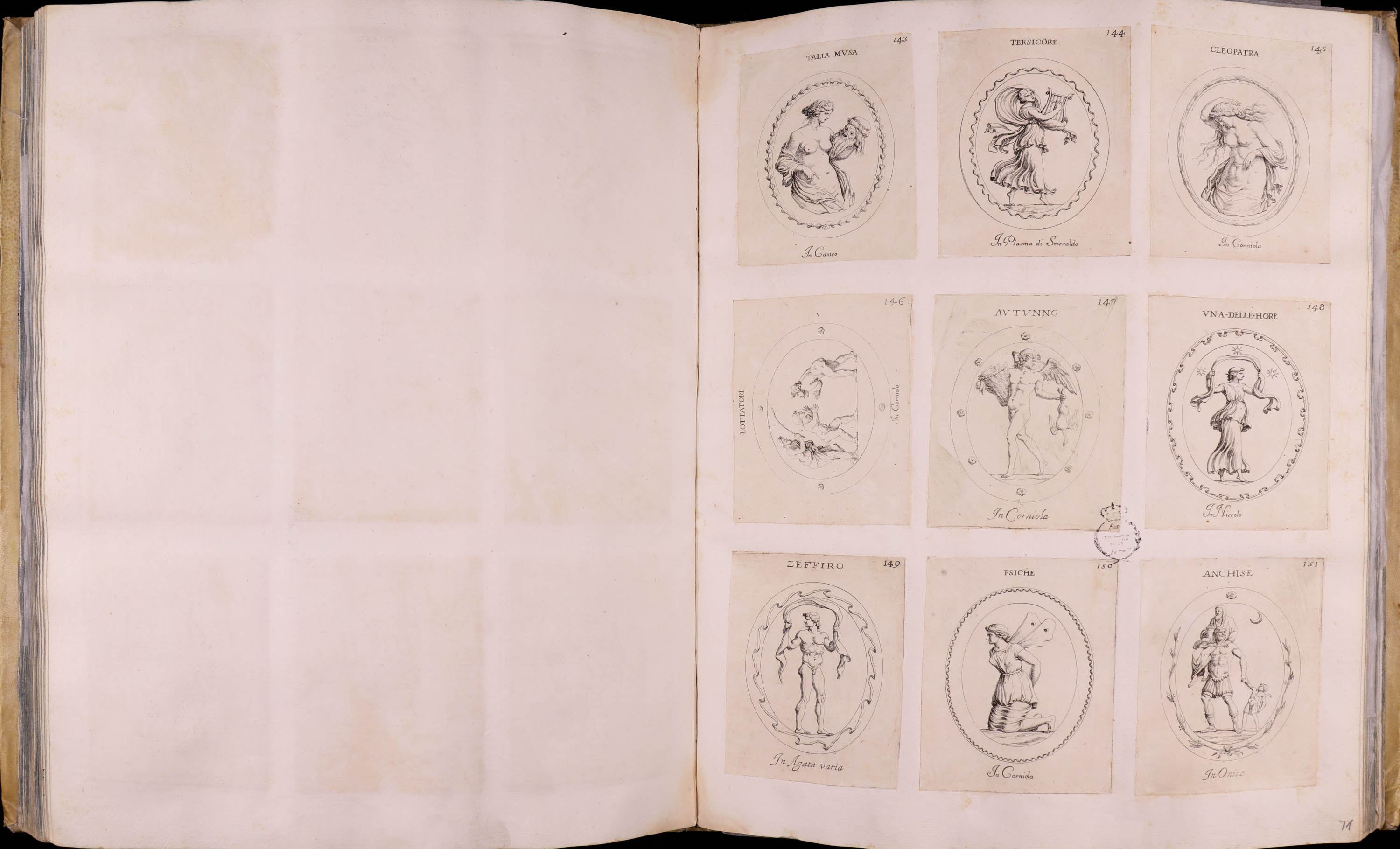 Primera edición del primer volumen de dos (incompleto, faltan las primeras hojas de la dedicatoria al papa Alejandro VII, advertencia al lector e índice de las láminas), que recoge la colección de camafeos y gemas del cardenal Francesco Barberini en 214 aguafuertes.