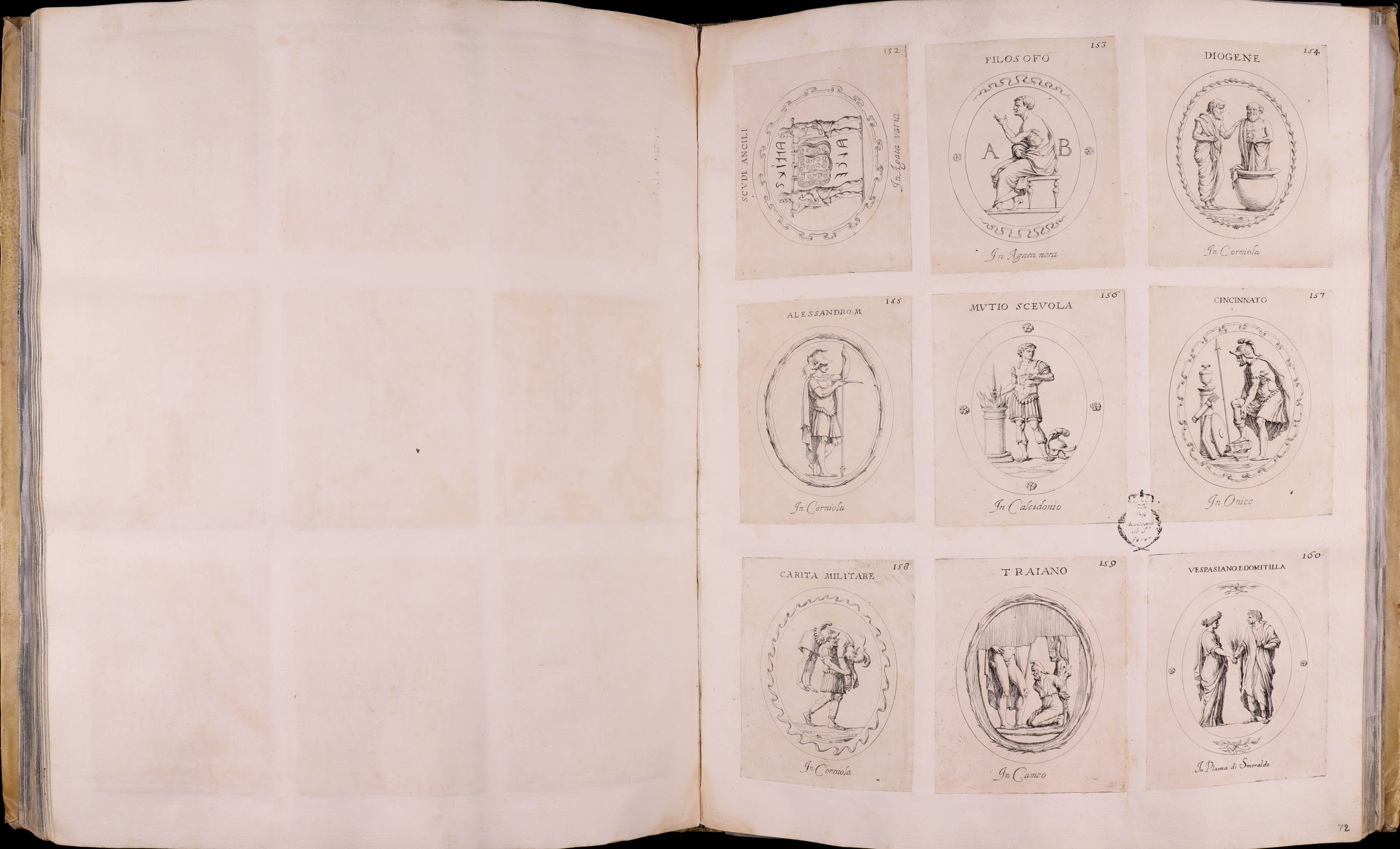 Primera edición del primer volumen de dos (incompleto, faltan las primeras hojas de la dedicatoria al papa Alejandro VII, advertencia al lector e índice de las láminas), que recoge la colección de camafeos y gemas del cardenal Francesco Barberini en 214 aguafuertes.